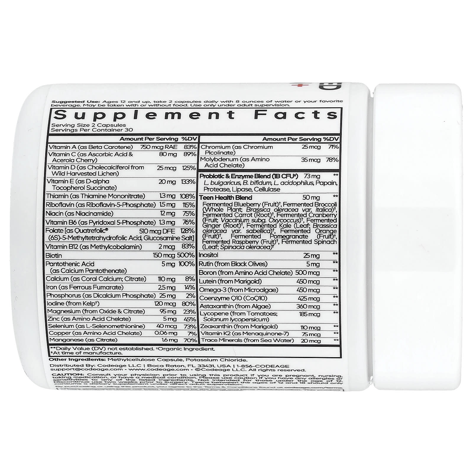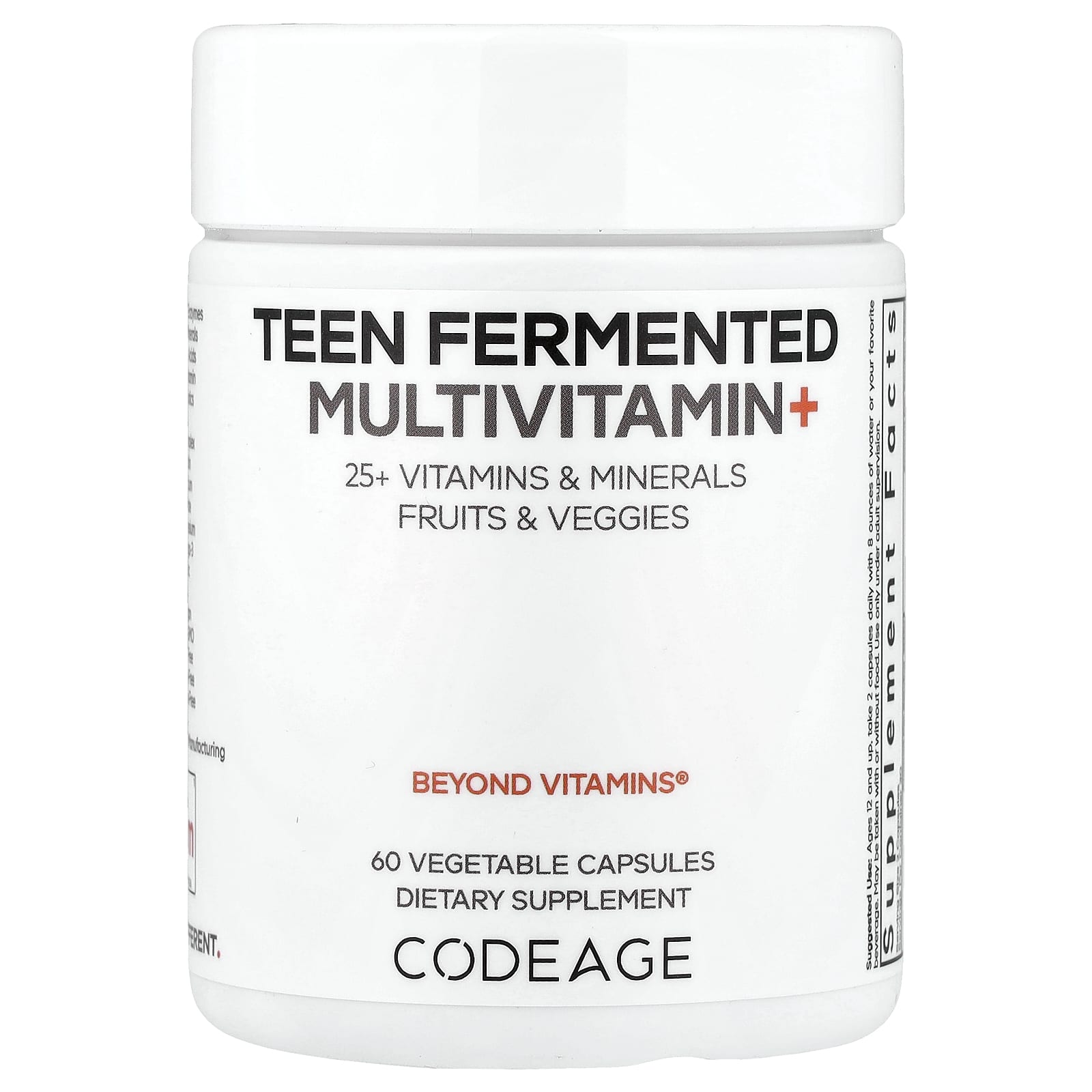 25 + Vitamins & MineralsFruits & VeggiesBeyond Vitamins®Dietary Supplement Digestive EnzymesTrace MineralsAmino AcidsMultivitaminProbioticsB-ComplexBiotinCalciumFolateMagnesiumOmega-3ZincVeganNon-GMOSoy-FreeDairy-FreeGluten-FreeCGMP Certified ManufacturingFeel DifferentCodeage Teen Multivitamin+ is a comprehensive blend of over 25 vitamins and minerals designed specifically for teenagers boys and girls aged 12 to 18. This formula includes essential vitamins such as A, B, C, D, E, and K, along with biotin, folate, calcium, omega-3, CoQ10, zinc, magnesium, selenium, and phosphorus, plus enzymes, probiotics, and organic whole foods.