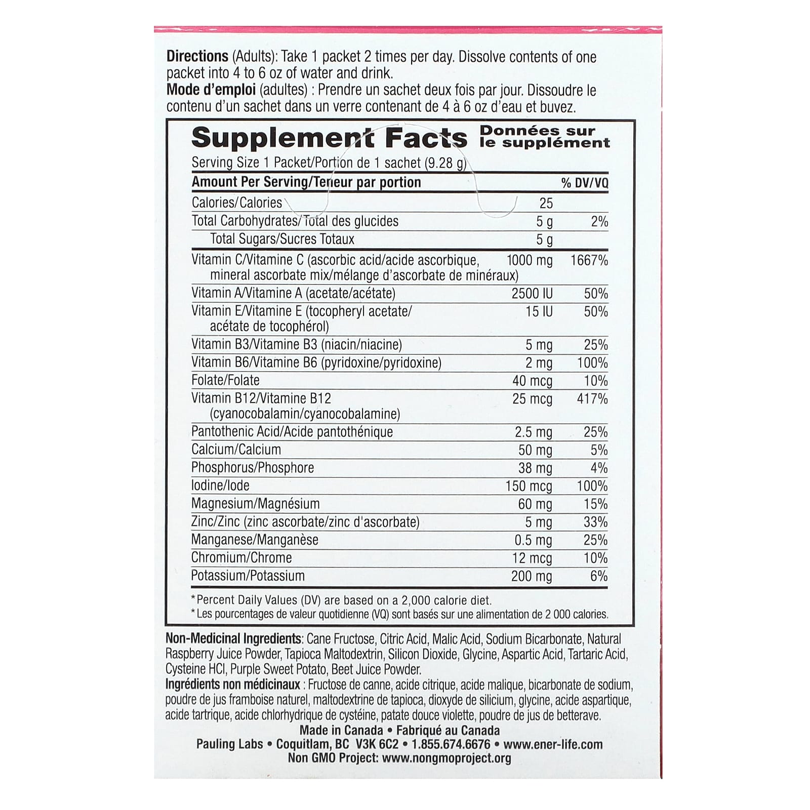 Non-Medicinal Ingredients:  Cane fructose, citric acid, malic acid, sodium bicarbonate, natural raspberry juice powder, tapioca maltodextrin, silicon dioxide, glycine, aspartic acid, tartaric acid, cysteine HCl, purple sweet potato, beet juice powder.