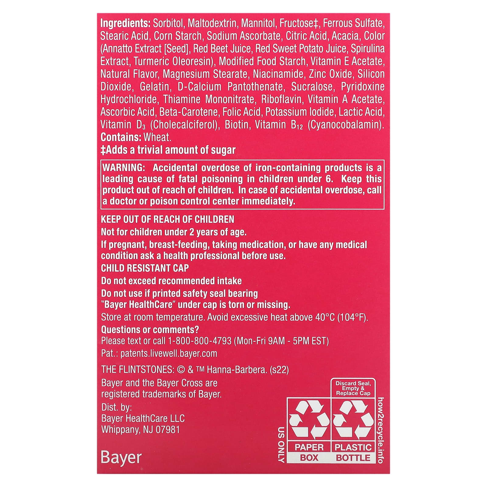 Children´s Vitamin Brand#1 Pediatrician Recommended+ Extra§ IronSupports Healthy Growth & DevelopmentWith Iron, Vitamins A & DNo Sugar, Artificial Flavors, High Fructose Corn SyrupDietary SupplementSupports immune health with Vitamins A, C, D & E.Supports energy with Vitamins B1, B2, B3, B5, B6 & B12 to help convert food to fuel.Supports eye health with Vitamins A, C, & E.8 Fun CharactersFredPebblesBettyThe Great GazooBarneyWilmaBamm BammDino§With 44% DV more Iron than Flintstones Complete Chewable Tablets (18 mg vs. 10 mg).