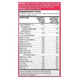 Sorbitol, maltodextrin, mannitol, fructose‡, ferrous sulfate, stearic acid, corn starch, sodium ascorbate, citric acid, acacia, color (annatto extract [seed], red beet juice, red sweet potato juice, spirulina extract, turmeric oleoresin), modified food starch, vitamin E acetate, natural flavor, magnesium stearate, niacinamide, zinc oxide, silicon dioxide, gelatin, d-calcium pantothenate, sucralose, pyridoxine hydrochloride, thiamine mononitrate, riboflavin, vitamin A acetate, ascorbic acid, beta-carotene, folic acid, potassium iodide, lactic acid, vitamin D3 (cholecalciferol), biotin, vitamin B12 (cyanocobalamin).Contains: wheat.‡Adds a trivial amount of sugar