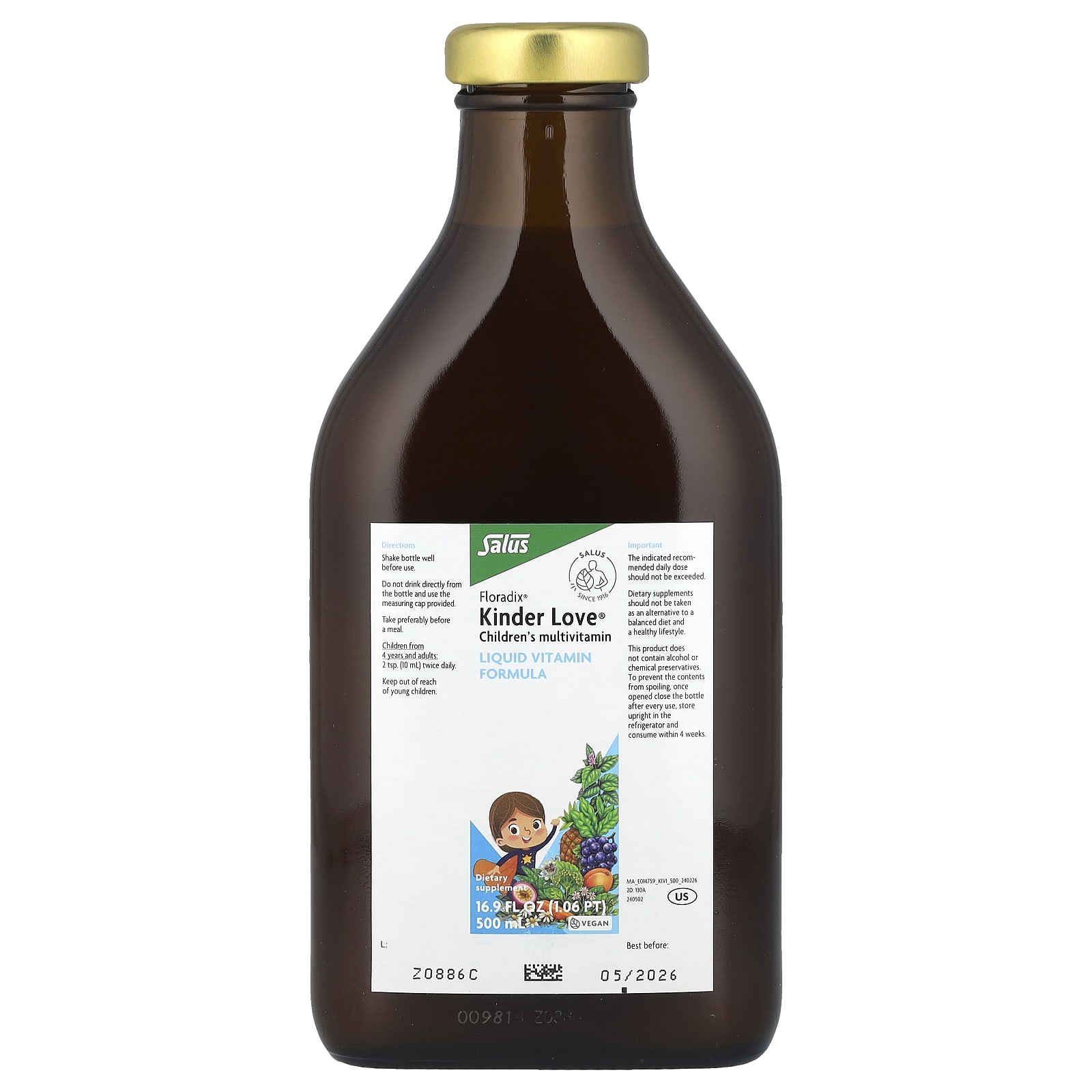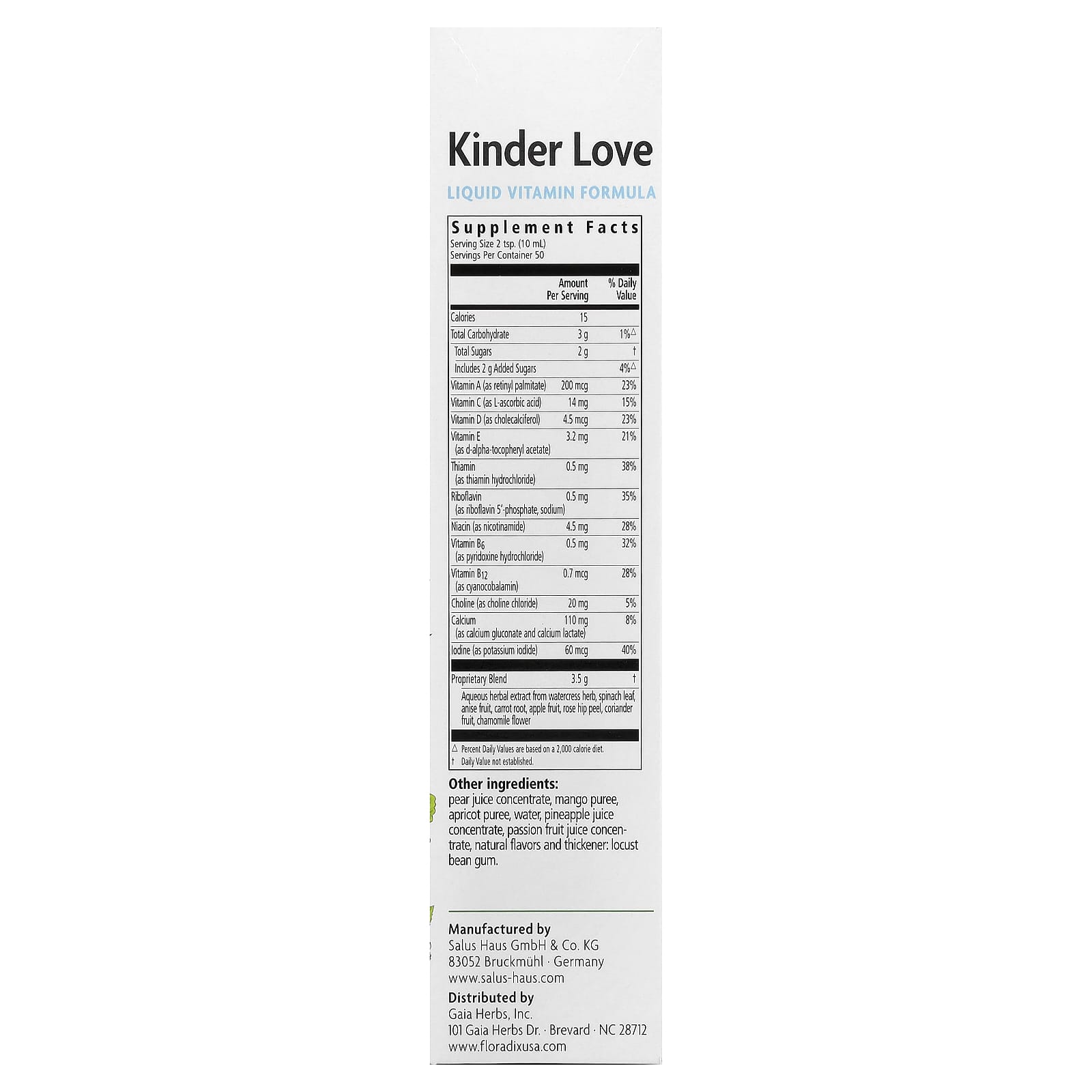 Since 1946Liquid Vitamin FormulaWith Vitamins A and C for Immune HealthEasily Absorbed and Gentle to DigestDietary SupplementVeganNo Alcohol No Preservatives No Colorings Gluten-Free Suitable for VegansWith several nutrients vital for healthy growth and development of bones.Floradix Kinder Love is a delicious dietary supplement for children providing calcium and vitamin D to support normal growth and development of your child’s bones.Floradix Kinder Love liquid formula is easily absorbed and gentle to digest, with a delicious fruit flavor they’ll love.About Salus Since the foundation of Salus Haus in 1916, the utmost importance has been placed on the careful selection of ingredients for our products. At Salus we do not use genetically modified raw materials. We combine nature with innovation and quality, developing new products with the use of state-of- the-art analytical methods in our laboratories. Salus applies the highest quality standards in Europe by carefully controlling the production of raw materials and finished products.