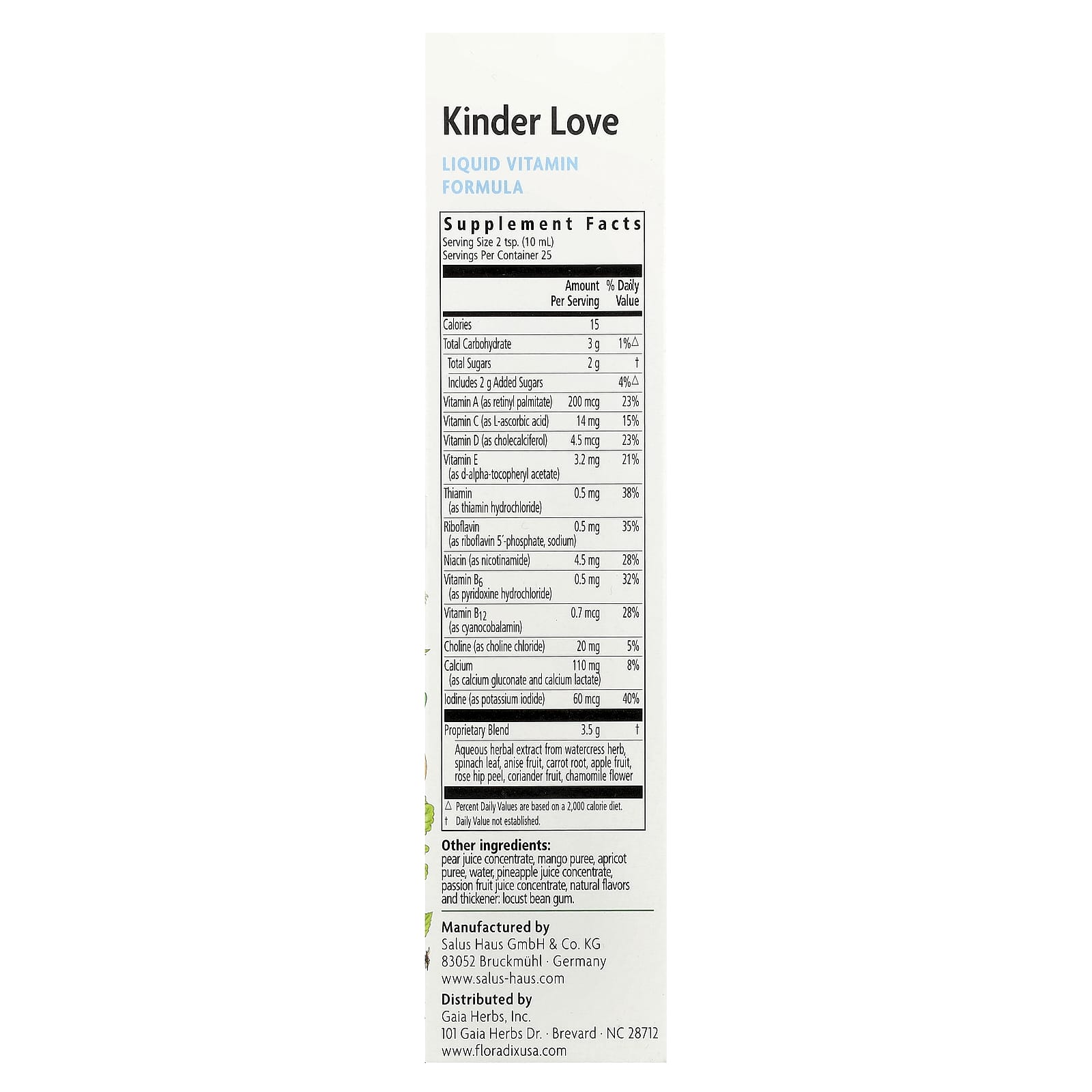 Since 1916Liquid Vitamin FormulaWith Vitamins A and C for Immune HealthEasily Absorbed and Gentle to DigestDietary SupplementVeganNo AlcoholNo PreservativesNo ColoringsGluten FreeSuitable for VegansWith several nutrients vital for healthy growth and development of bones.Floradix Kinder Love is a delicious dietary supplement for children providing calcium and vitamin D to support normal growth and development of your child’s bones. Floradix Kinder Love liquid formula is easily absorbed and gentle to digest, with a delicious fruit flavor they’ll love.About Salus Since the foundation of Salus Haus in 1916, the utmost importance has been placed on the careful selection of ingredients for our products. At Salus we do not use genetically modified raw materials. We combine nature with innovation and quality, developing new products with the use of state- of-the-art analytical methods in our laboratories. Salus applies the highest quality standards in Europe by carefully controlling the production of raw materials and finished products.