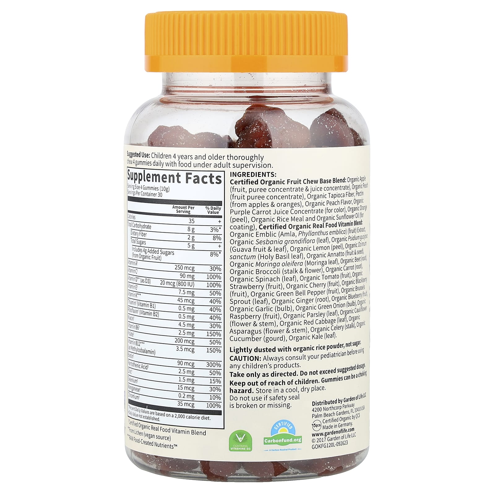 Organic Fruit FlavorUSDA OrganicNon-GMO Project VerifiedReal FruitDietary SupplementKosherContains Vitashine D3Certified Organic by QCS9 Whole Fruits in Every BottleNSF Certified Gluten-FreeSoy, Dairy & Nut-FreeCertified B CorporationOnly the best for your kids, Garden of Life Organics Kids Multi Gummies are Certified USDA Organic and Non-GMO Project Verified fruit and vitamin gummies. Made with nine organic whole fruits in every bottle—no synthetic vitamins—Garden of Life Organics Kids Multi Gummies come in two yummy flavors; organic fruit and organic cherry. Each chew is made with pectin from non-GMO apples and organic orange peel—no pig gelatin.The Garden of Life Organics line of gummies is a true health crusader, ditching the conventional vitamin gummy course by steering clear of processed sugars and syrups, artificial colors and flavorings, animal products, and GMOs. With our clean gummy technology, there are no “candy” ingredients, no pig gelatin or corn starch. You can rest assured you are receiving a true, whole food vitamin fruit chew that not only is good for you, but is great-tasting!
