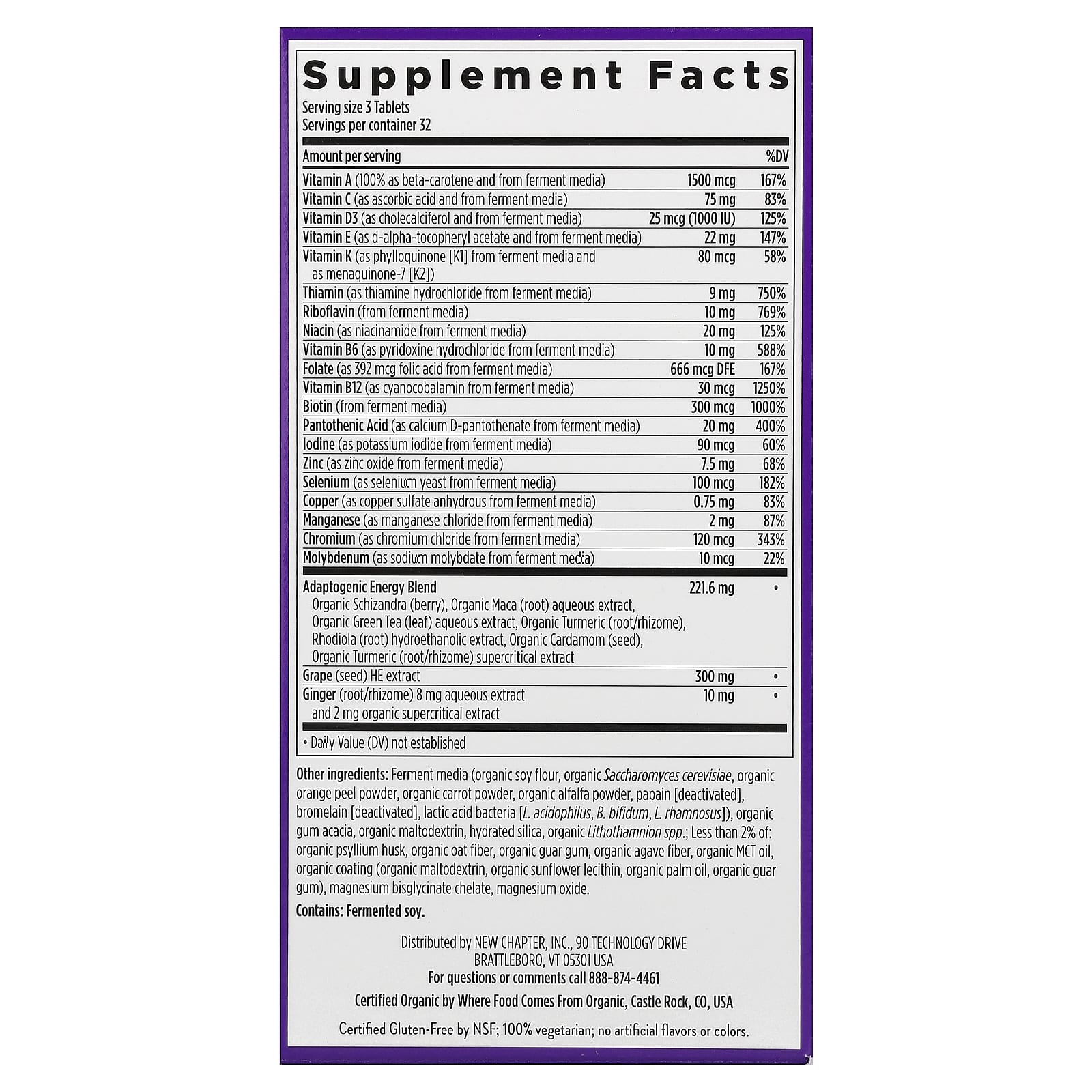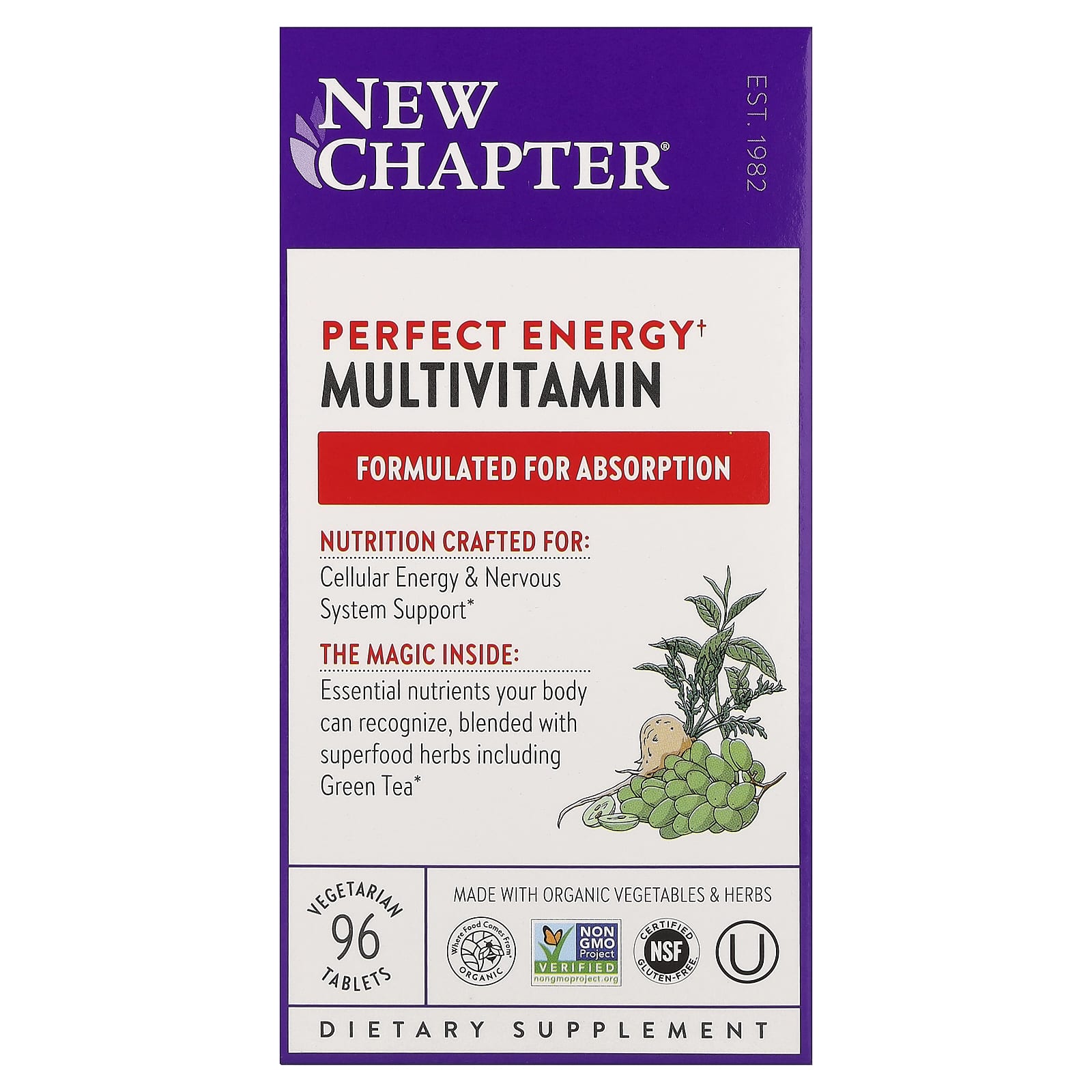 Est.1982 Formulated For Absorption Made With Organic Vegetables & Herbs Non GMO Project Verified NSF Certified Gluten-FreeKosher Dietary Supplement Certified B Corporation 100% VegetarianNo Artificial Flavors or ColorsCertified Organic by Where Food Comes From OrganicWith Gratitude From Vermont Nutrition Crafted For: Balanced Energy & Nervous System Support The Magic Inside: Essential nutrients your body can recognize, blended with superfood herbs including energy-boosting Green Tea.Complete MultivitaminEnergy supportExpertly formulated to help maintain your healthy energy balance, since even marginal nutrition depletion can affect energy levels. B Vitamins also support the nervous system.Rich in B vitamins8 B Vitamins promote energy metabolism by converting proteins, fat and carbohydrates into energy, and support mitochondria-the cellular powerhouses-in providing energy for daily activities or workouts.Multitasking multivitaminsComplete support for overall health and system-specific benefits, with nutrients for heart, brain, bone, immune & vision support, and healthy hair, skin & nails.Boosting herbsInspired by tradition and grounded in science, advanced organic botanicals include Maca, Green Tea, and Turmeric.Absorb the good stuffWe fine-tune the levels of each high-quality vitamin & mineral, choose types that work best with the body, and ferment key nutrients with probiotics and whole food.