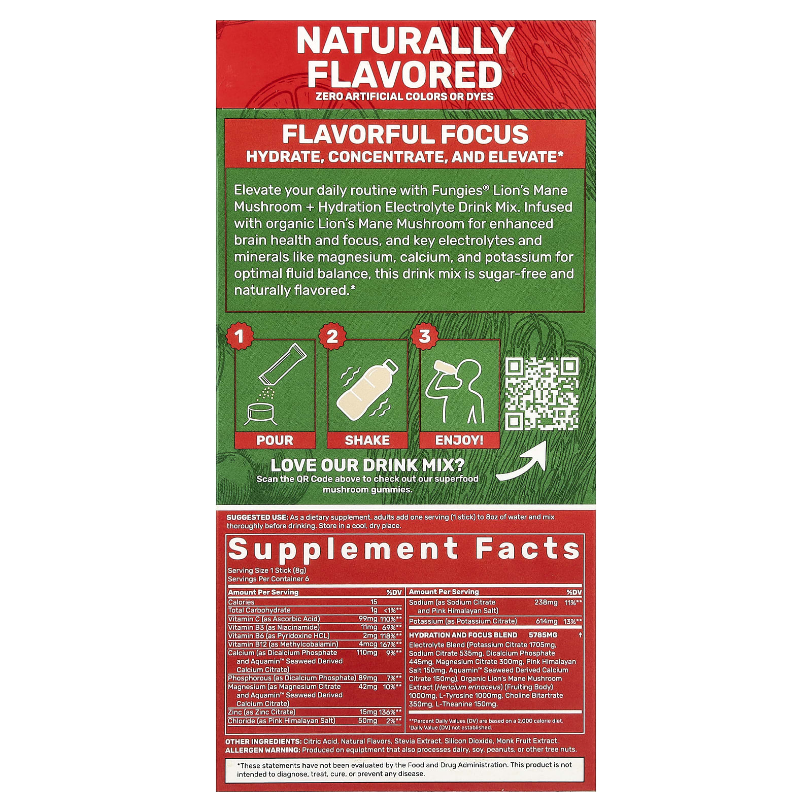 0 g Sugar1,000 mg Organic Lion’s Mane Per Stick Pack6 On-The-Go Stick PacksSupports Hydration, Brian Health, and FocusNaturally Flavored with Other Natural FlavorsDietary SupplementOnly The Good StuffGMO FreeGluten FreeVegan FriendlyZero Artificial Colors or DyesHydrate, Concentrate, and ElevateFlavorful FocusElevate your daily routine with Fungies® Lion’s Mane Mushroom + Hydration Electrolyte Drink Mix. Infused with organic Lion’s Mane Mushroom for enhanced brain health and focus, and key electrolytes and minerals like magnesium, calcium, and potassium for optimal fluid balance, this drink mix is sugar-free and naturally flavored.Hydration Just Got Smarter Enhanced Hydration Brain HealthFocus & ClarityHealthy Mood