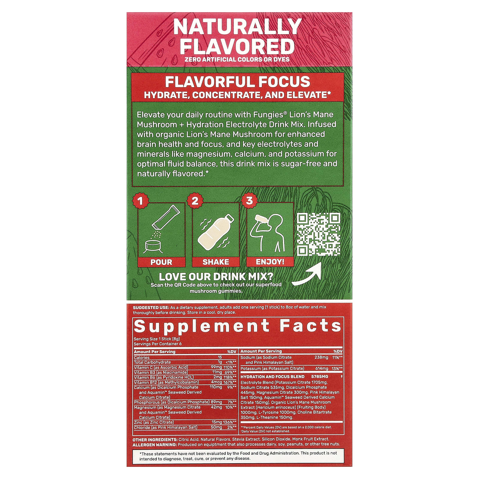 Fungies, Lion’s Mane Mushroom + Hydration, Electrolyte Drink Mix, Watermelon, 6 Stick Packs, 0.28 oz (8 g) Each