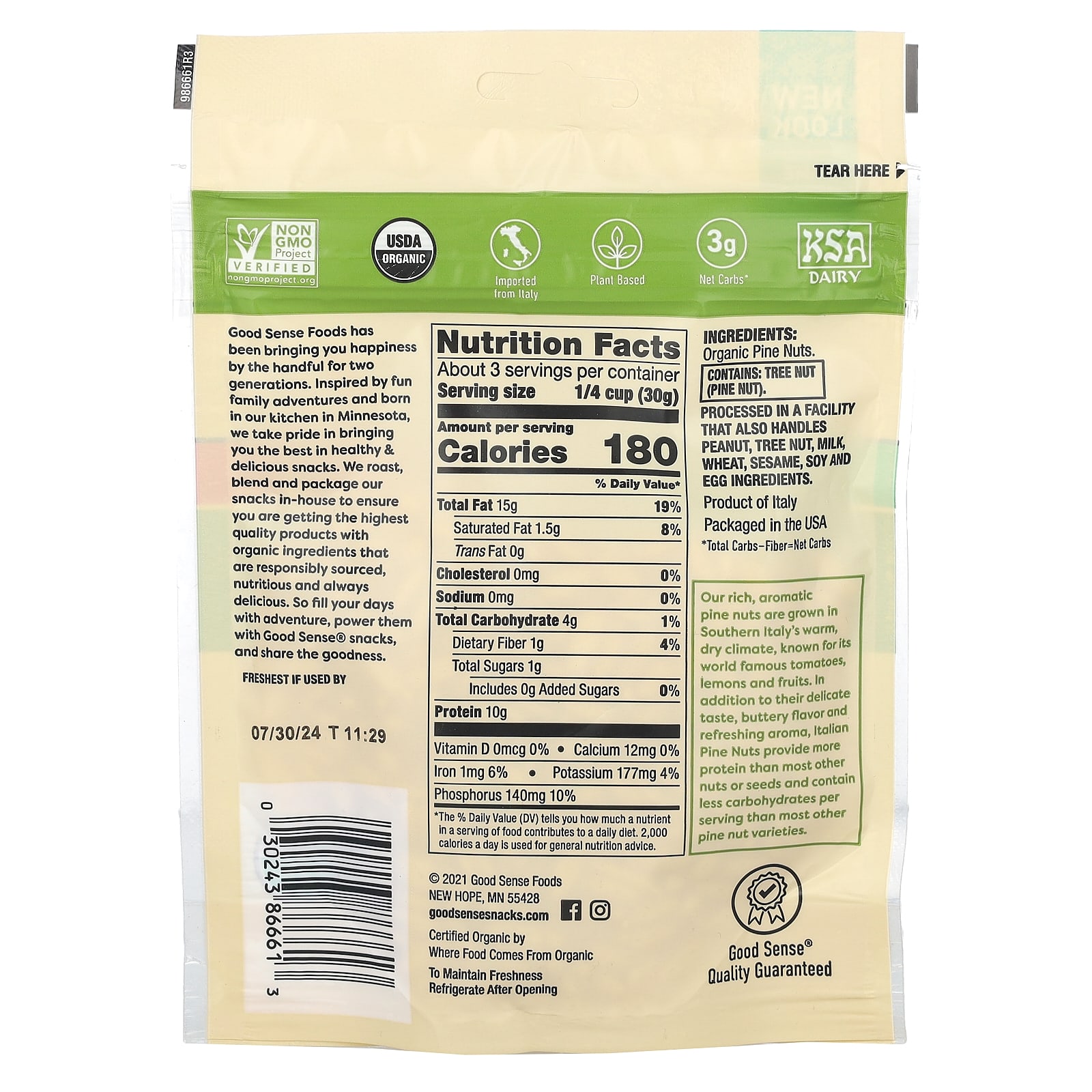 Family Owned Since 197610 g Protein Per ServingCertified Non-GMOImported Italian Premium USDA Organic Non GMO Project Verified Plant Based 3 g Net Carbs*Kosher DairyGood Sense Quality GuaranteedCertified Organic by Where Food Comes From Organic Good Sense Foods has been bringing you happiness by the handful for two generations. Inspired by fun family adventures and born in our kitchen in Minnesota, we take pride in bringing you the best in healthy & delicious snacks. We roast, blend and package our snacks in-house to ensure you are getting the highest quality products with organic ingredients that are responsibly sourced, nutritious and always delicious. So fill your days with adventure, power them with Good Sense® snacks, and share the goodness.Our rich, aromatic pine nuts are grown in Southern Italy’s warm, dry climate, known for its world famous tomatoes, lemons and fruits. In addition to their delicate taste, buttery flavor and refreshing aroma, Italian Pine Nuts provide more protein than most other nuts or seeds and contain less carbohydrates per serving than most other pine nut varieties.*Total Carbs – Fiber = Net Carbs