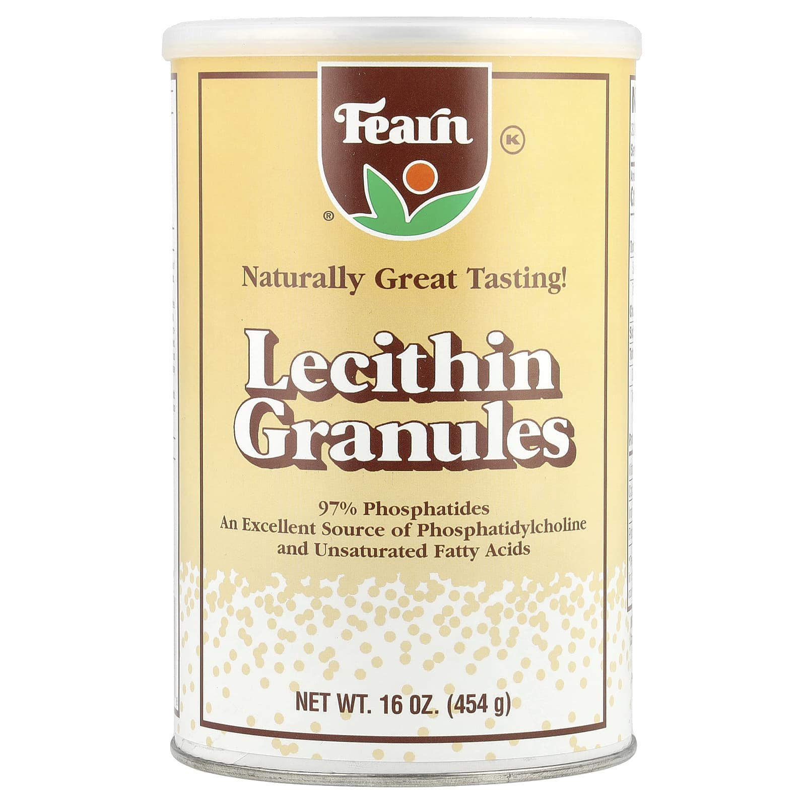 KosherNaturally Great Tasting!97% PhosphatidesAn Excellent Source of Phosphatidylcholine and Unsaturated Fatty Acids”Have You Had Your Lecithin Today?”Guaranteed Potency and FreshnessFearn Lecithin Granules contain 97% phosphatides, the highest concentration of any lecithin product available. Freshness is guaranteed by Fearn Natural Foods, leaders in lecithin and soy products for over 70 years.Fearn Lecithin Granules are pure lecithin. The high quality of this lecithin makes it unnecessary for Fearn to enhance the flavor or aroma with added ingredients.Nature put a small amount of lecithin into many foods. But with today’s processing and refining methods of the foods we eat, much of the lecithin is removed.Lecithin is an important part of our diet. It helps our bodies emulsify fat and allows our bodies to digest it more easily. It also helps our bodies assimilate many of the other required nutrients in our diet.Fearn Lecithin Granules are high in phosphatidylcholine and phosphatidylinositol, giving us the whole complex of phosphatides. They are also an excellent source of essential fatty acids, including linoleic acid.