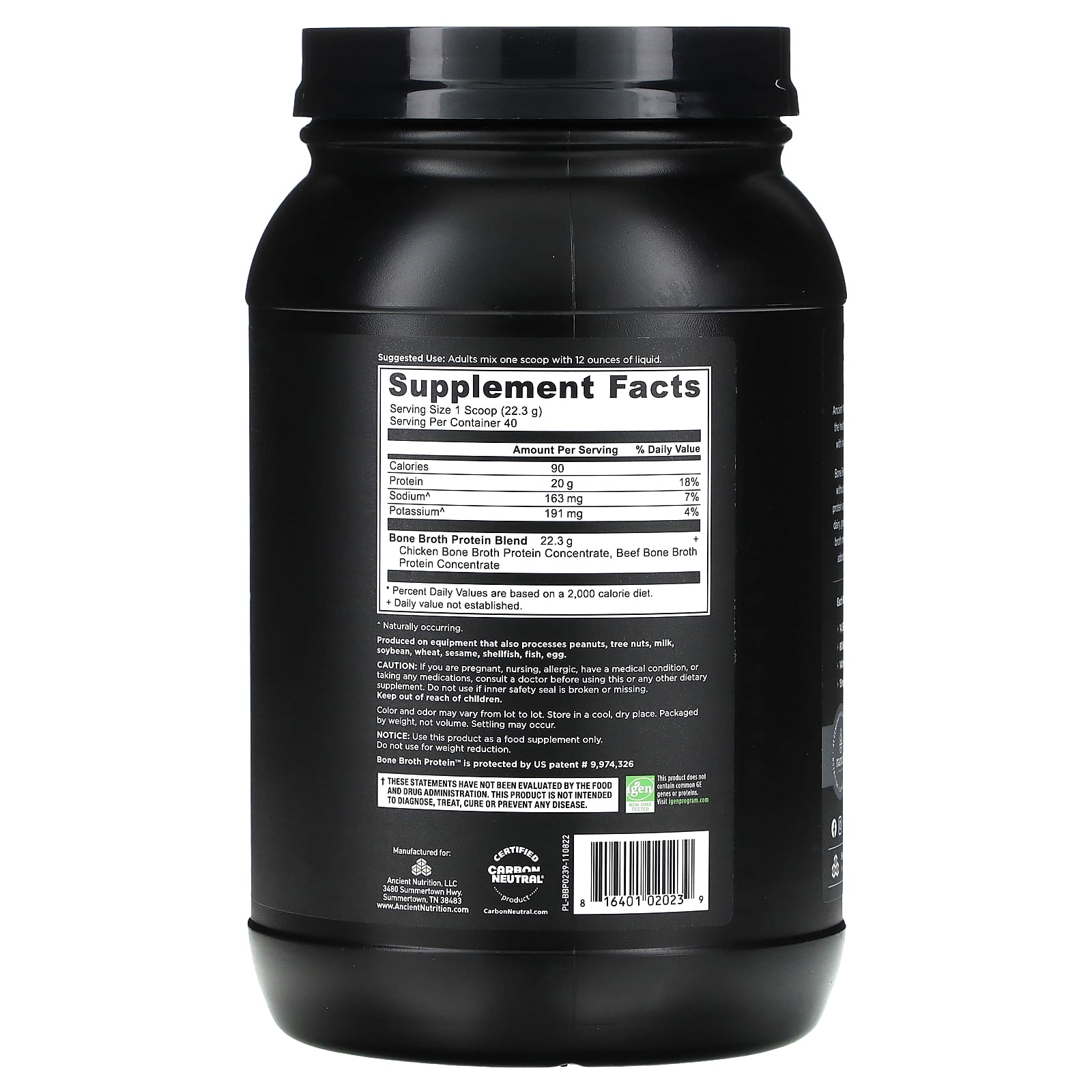 Supports a Healthy Gut, Joints and Inflammation Response20 g Protein Per ServingWhole Food Dietary SupplementSkinJointsPatented FormulaDairy Freer.a.n.c.hsm Project – Regenerative Agriculture, Nutrition, Climate, HealthIgen Non-GMO TestedCarbon Neutral® Certified ProductAncient Nutrition has one goal-to transform the health of every individual on the planet with history’s most powerful superfoods.Bone Broth Protein is Paleo friendly, made without common allergens and the ideal protein source for those who are sensitive to dairy, grains, eggs, nuts, and legumes. Bone broth made easy! Great in soups, stews or added to your favorite savory recipes.Each Serving Contains Approximately: 14,500 mg Collagen800 mg Chondroitin 140 mg Hyaluronic Acid 15 mg Glucosamine