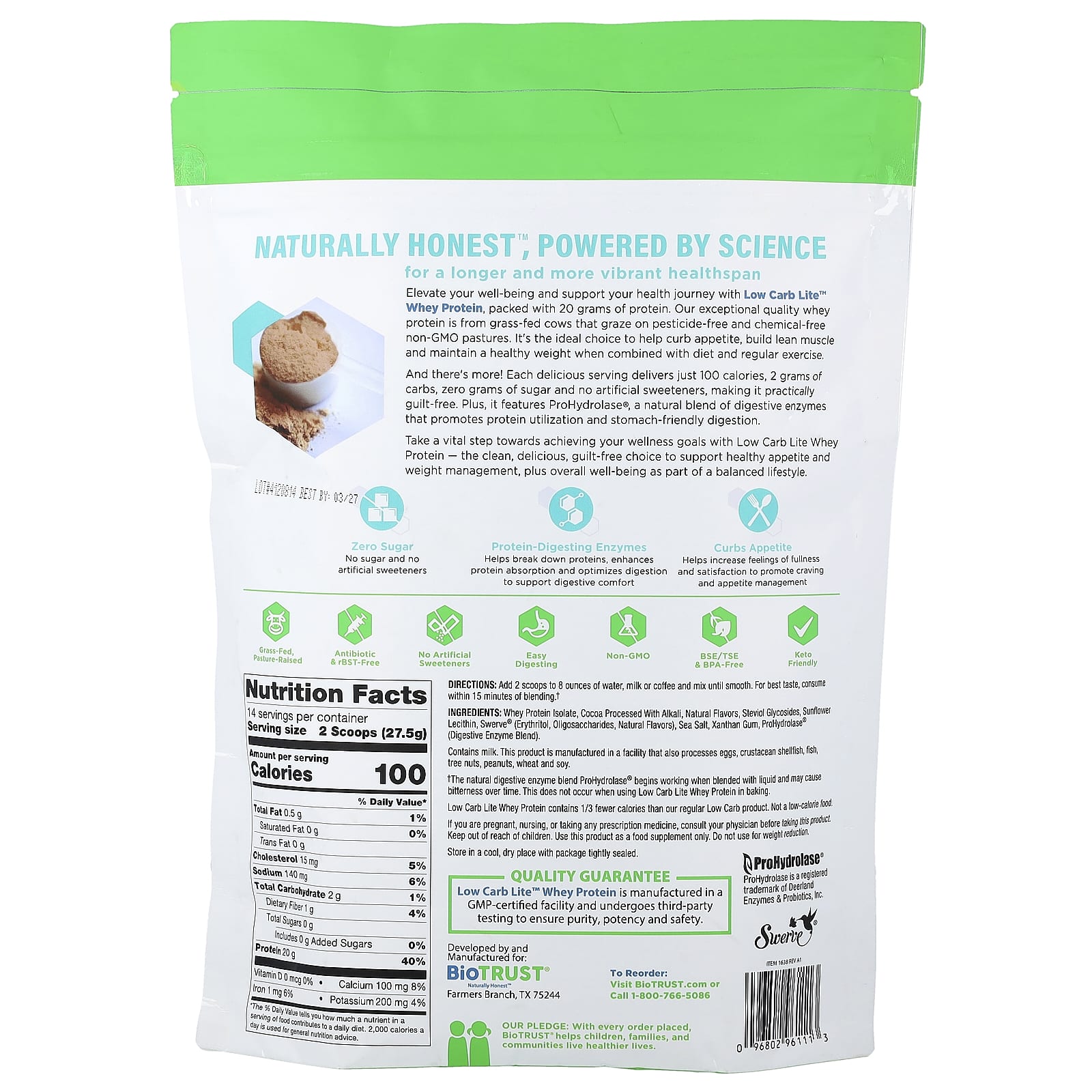 Non-GMONo Added HormonesNo Artificial SweetenersNaturally Honest™ Clean Ingredients20 g Clean ProteinOnly 100 CaloriesGrass-Fed, Pasture-Raised Whey ProteinFlavored with Other Natural FlavorsProtein PowderNo Added JunkProtein PowderAntibiotic & rBST-FreeEasy DigestingBSE/TSE & BPA FreeKeto FriendlyProHydrolase®Swerve®NATURALLY HONEST™ Powered by Science for a longer and more vibrant healthspanElevate your well-being and support your health journey with Low Carb Lite™ Whey Protein, packed with 20 grams of protein. Our exceptional quality whey protein is from grass-fed cows that graze on pesticide-free and chemical-free non-GMO pastures. It’s the ideal choice to help curb appetite, build lean muscle and maintain a healthy weight when combined with diet and regular exercise. And there’s more! Each delicious serving delivers just 100 calories, 2 grams of carbs, zero grams of sugar and no artificial sweeteners, making it practically guilt-free. Plus, it features ProHydrolase®, a natural blend of digestive enzymes that promotes protein utilization and stomach-friendly digestion. Take a vital step towards achieving your wellness goals with Low Carb Lite Whey Protein – the clean, delicious, guilt-free choice to support healthy appetite and weight management, plus overall well-being as part of a balanced lifestyle.Zero Sugar No sugar and no artificial sweeteners.Protein-Digesting Enzymes Helps break down proteins, enhances protein absorption and optimizes digestion to support digestive comfort.Curbs Appetite Helps increase feelings of fullness and satisfaction to promote craving and appetite management.Low Carb Lite Whey Protein contains 1/3 fewer calories than our regular Low Carb product. Not a low calorie food.