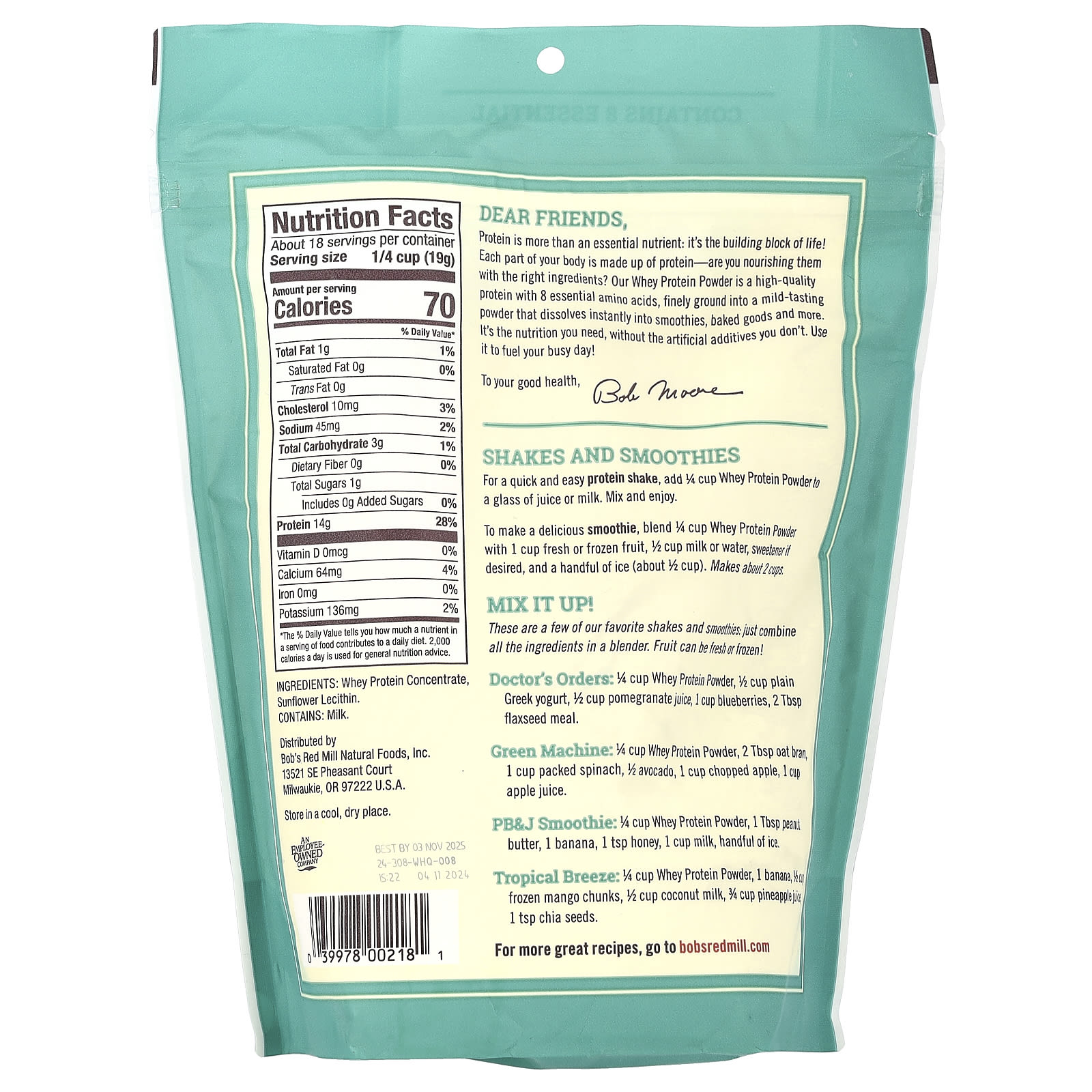 Contains 8 Essential Amino Acids To Your Good Health® – Bob MoorePremium Quality14 g Protein Per Serving 2 Simple Ingredients No Added Flavors, Colors or Sweeteners Not a Low Calorie FoodKosher DairyAn Employee Owned CompanyDear Friends,Protein is more than an essential nutrient: it’s the building block of life! Each part of your body is made up of protein—are you nourishing them with the right ingredients? Our Whey Protein Powder is a high-quality protein with 8 essential amino acids, finely ground into a mild-tasting powder that dissolves instantly into smoothies, baked goods and more. It’s the nutrition you need, without the artificial additives you don’t. Use it to fuel your busy day!To your good health, Bob Moore