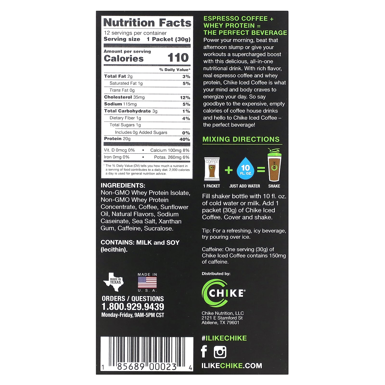 Coffee + Protein2 Espresso Shots20 g Whey Protein1 g SugarMade with Real Espresso CoffeeGluten FreeHigh ProteinLow FatNo Added SugarVegetarianNo Artificial Colors or FlavorsEspresso Coffee + Whey Protein = The Perfect BeveragePower your morning, beat that afternoon slump or give your workouts a supercharged boost with this delicious, all-in-one nutritional drink. With rich flavor, real espresso coffee, and whey protein, Chike Iced Coffee is what your mind and body craves to energize your day. So say goodbye to the expensive, empty calories of coffeehouse drinks and hello to Chike Iced Coffee – the perfect beverage!