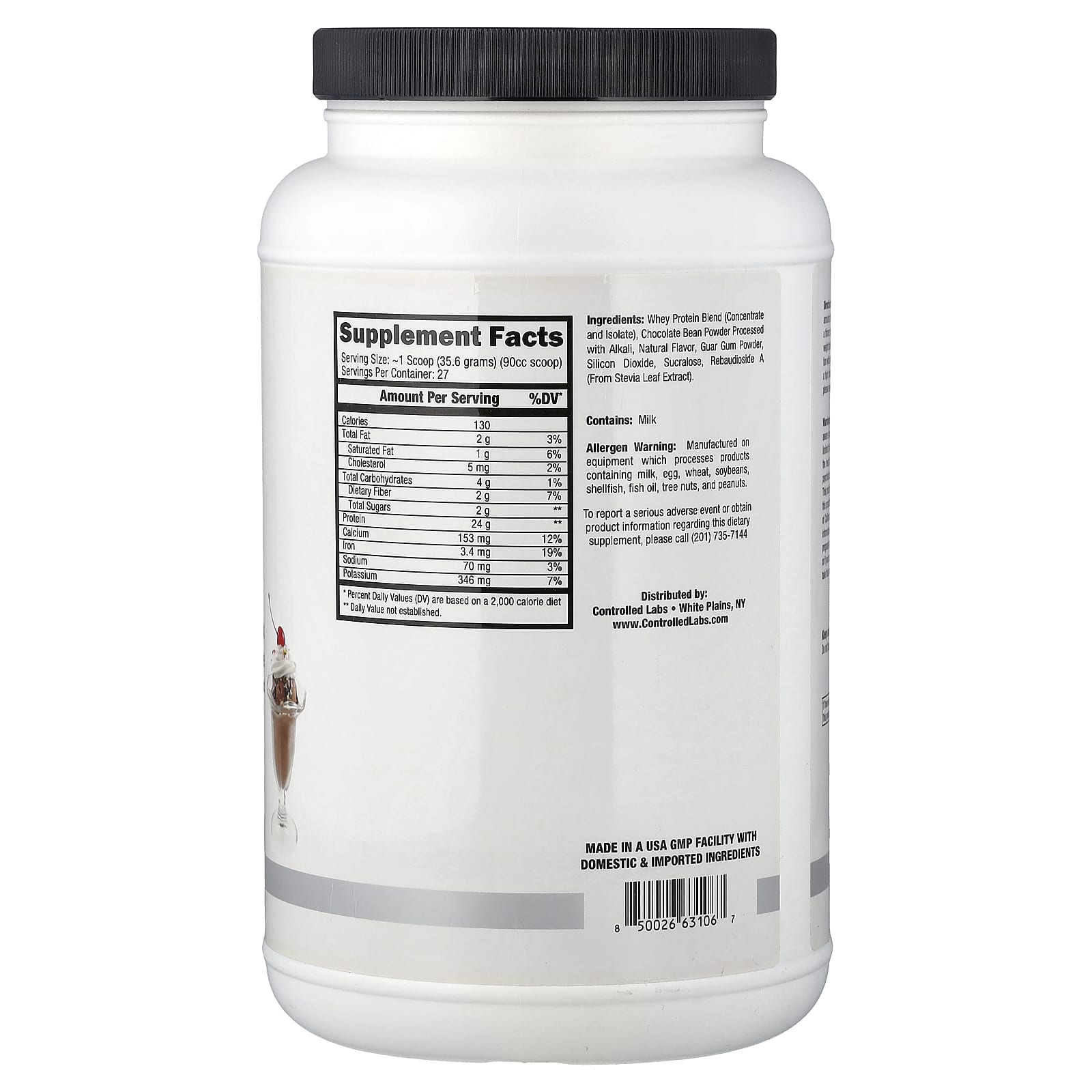 Whey protein blend (concentrate and isolate), chocolate bean powder processed with alkali, natural flavor, guar gum powder, silicon dioxide, sucralose, rebaudioside a (from stevia leaf extract).Contains: MilkAllergen warning: Manufactured on