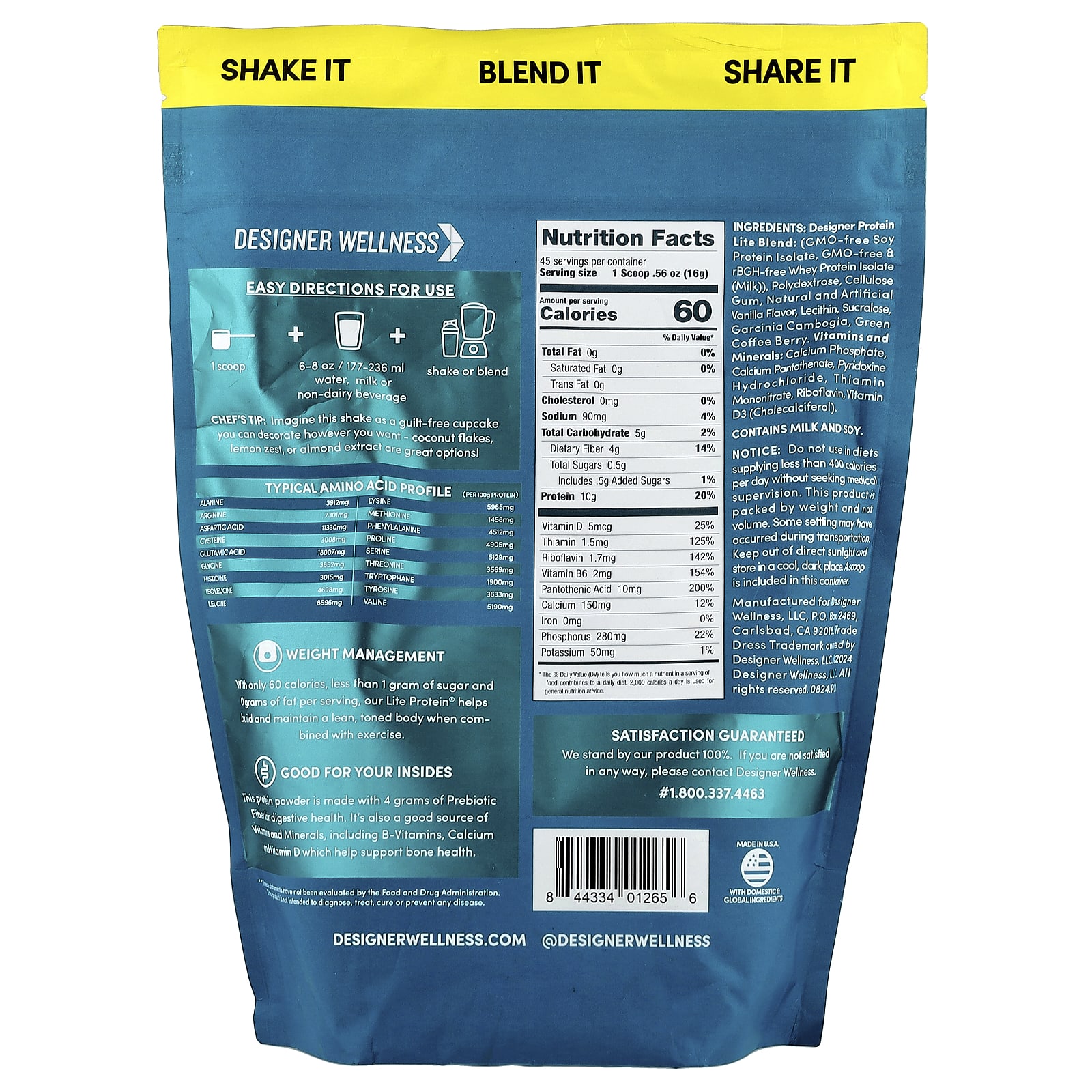 Designer protein lite blend: (gmo-free soy protein isolate, gmo-free & rbgh-free whey protein isolate (milk)), polydextrose, cellulose gum, natural and artificial vanilla flavor, lecithin, sucralose, garcinia cambogia, green coffee berry. vitamins and minerals: calcium phosphate, calcium pantothenate, pyridoxine hydrochloride, thiamin mononitrate, riboflavin, vitamin d3 (cholecalciferol). Contains milk and soy.Made in U.S.A with domestic & global ingredients.