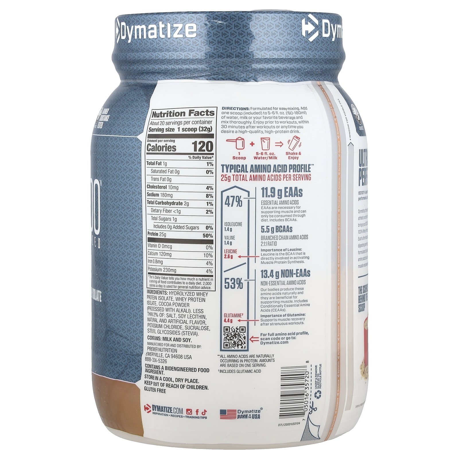 Protein 25 gBCAAs 5.5 gLeucine 2.6 gInformed-Choice – We Test, You TrustBanned Substance TestedProtein Powder100% Whey Protein Isolate^20 ServingsNaturally and Artificially FlavoredGet Dymatized®Typical Amino Acid Profile** 25 g Total Amino Acids Per Serving47% – Isoleucine 1.4 g / Valine 1.4 g / Leucine 2.6 g11.9 g EAAs – Essential Amino Acids EAAs are necessary for supporting muscle and can only be consumed through diet. Includes BCAAs.5.5 g BCAAs – Branched Chain Amino Acids 2:1:1 ratio.53% – Glutamine† 4.4 g13.4 g Non-EAAs – Non-Essential Amino Acids – Our bodies produce these amino acids naturally and they are beneficial for supporting muscle. Includes Conditionally Essential Amino Acids (CEAAs).Informed ChoiceInformed Choice® is a quality assurance program that certifies that all nutritional supplements that bear the Informed Choice logo have been regularly tested for banned substances by the world class sports anti-doping lab, LGC.Ultra-Fast Absorbing Performance Protein IS0100® is ideal for those trying to maintain lower body fat, fuel athletic performance, and build lean muscle with a fitness or bodybuilding regimen.Dymatize, the trusted leader in athletic nutrition for over 25 years, brings you IS0100 Hydrolyzed, 100% Whey Protein Isolate∧. Each ultra-fast absorbing and easy digesting serving is scientifically formulated to deliver the protein and amino acids you need for next-level muscle recovery and performance.Engineered To Crush Goals:Building Muscle‡Muscle Recovery‡Muscle MaintenanceBest Times To Use:0-30 mins. Before Training0-30 mins. After TrainingThe Science Behind The ScoopMulti-Step PurificationISO100’s proteins are filtered to remove excess carbs, cholesterol, fat, sugar, and lactose.Hydrolyzed = Ultra-Fast AbsorbingISO100’s Hydrolyzed Whey Protein Isolate is broken down into smaller protein molecules (peptides).Super Easy MixingMixes completely, even if you use a cup and spoon!Tested For Purity & Banned Substance TestedOur products are banned substance tested and rigorously tested for quality and purity. ^100% of the protein from Whey protein isolate.**All Amino Acids are naturally occurring in protein. Amounts are based on one serving.†Includes Glutamic Acid.‡With a fitness or bodybuilding regimen.