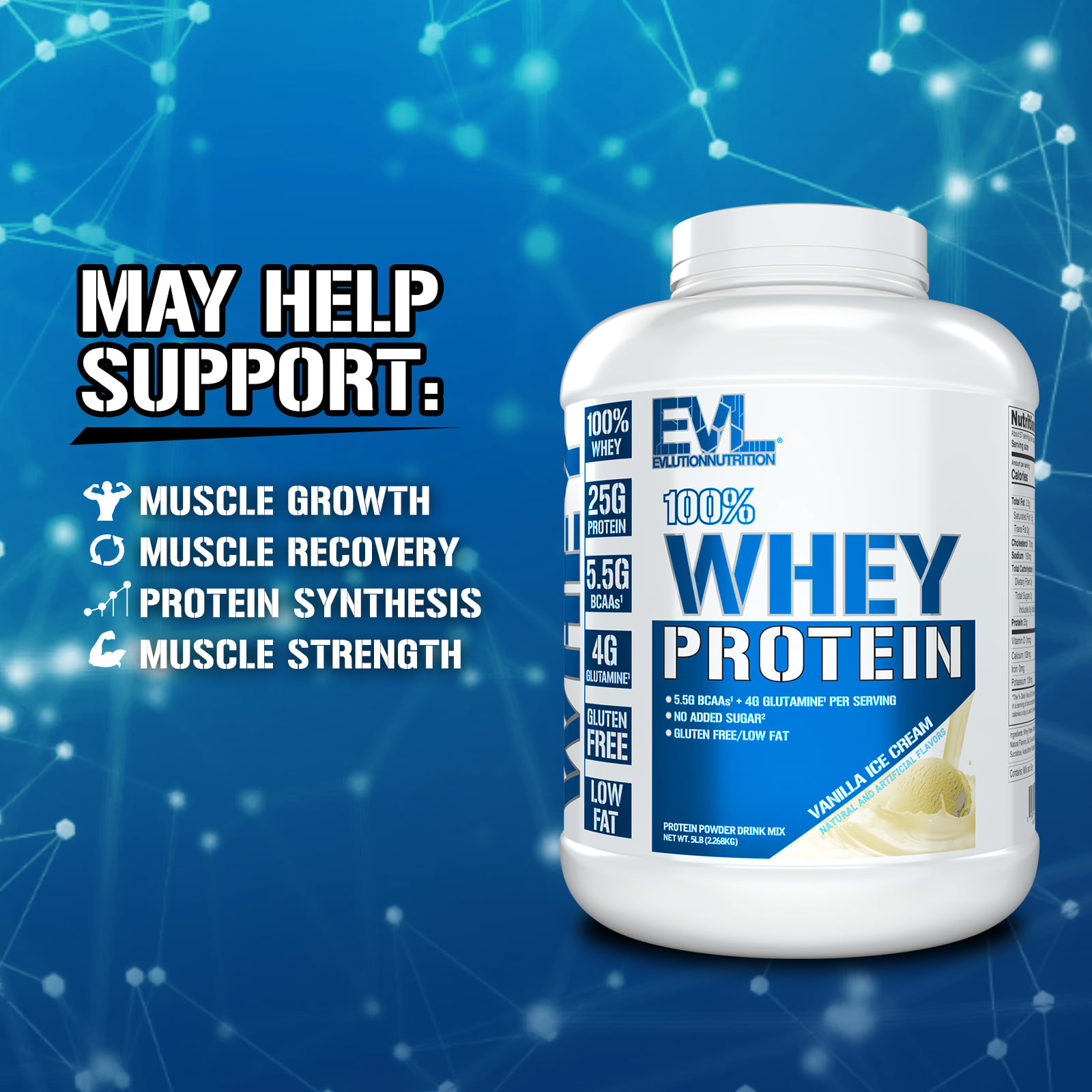 100% Whey25 g Protein5.5 g BCAAs¹4 g Glutamine¹ No Added Sugar²Gluten FreeLow FatProtein Powder Drink MixNatural and Artificial FlavorsWhen Combined With Regular Training 100% Whey Is Engineered To Support:Muscle GrowthMuscle RecoveryProtein Synthesis Muscle Strength100% Whey Stats:25 g of Whey Protein Per Serving100% Instantized Whey ProteinFast Absorbing for Use Before and After Training¹Naturally Occurring²Not a Low Calorie Food