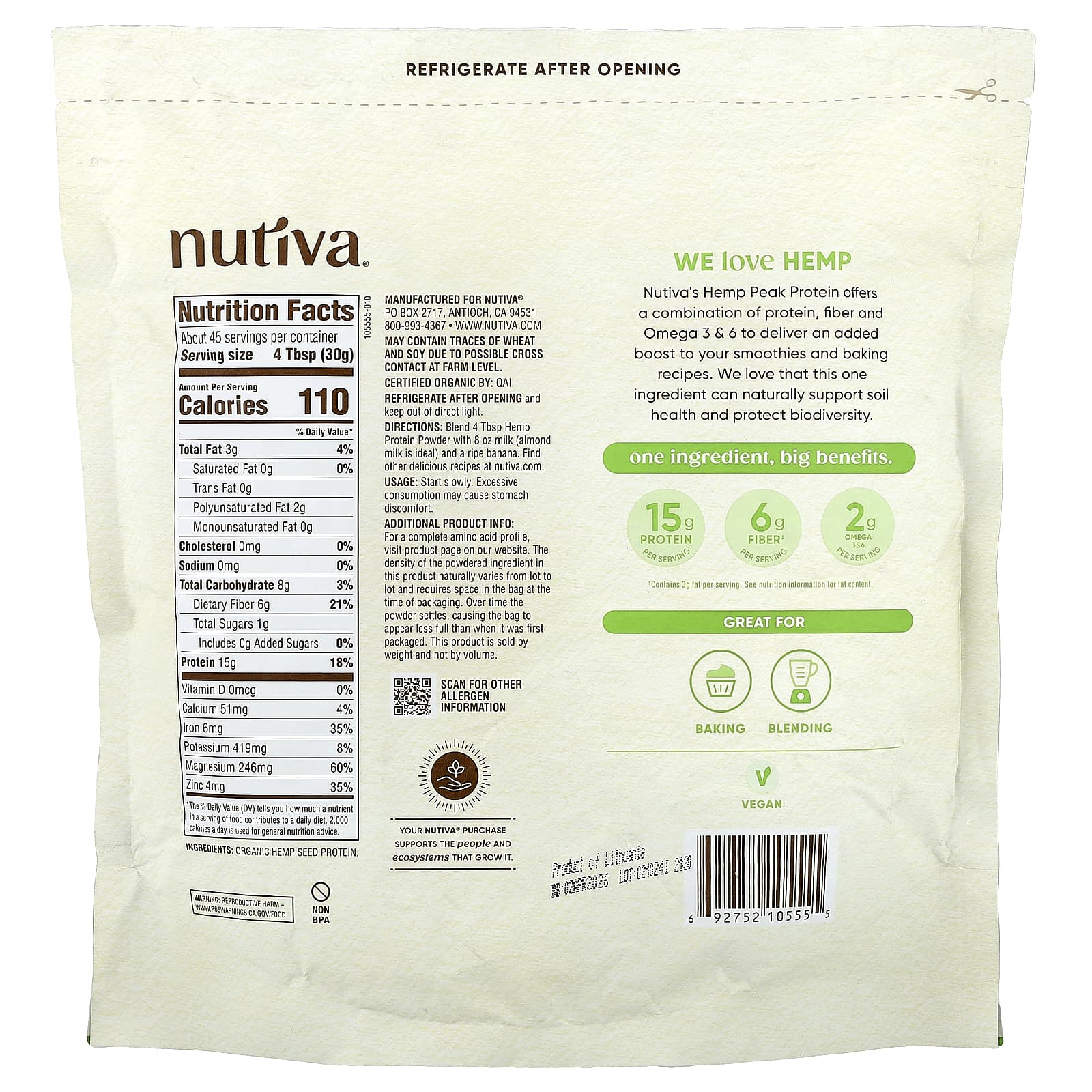 Peak Protein†USDA Organic Kosher 15 g Protein Per Serving 6 g Fiber Per Serving‡2 g Omega 3 & 6 Per Serving Non GMO Project Verified One Ingredient, Big NutritionCertified VeganGluten Free Certified Organic By QAINon BPAWe love Hemp Nutiva’s Hemp Peak Protein offers a combination of protein, fiber and Omega 3 & 6 to deliver an added boost to your smoothies and baking recipes. We love that this one ingredient can naturally support soil health and protect biodiversity. one ingredient, big benefits.†Notice: Use this product as a food supplement only. Do not use for weight reduction. ‡Contains 3 g fat per serving. See nutrition information for fat content.