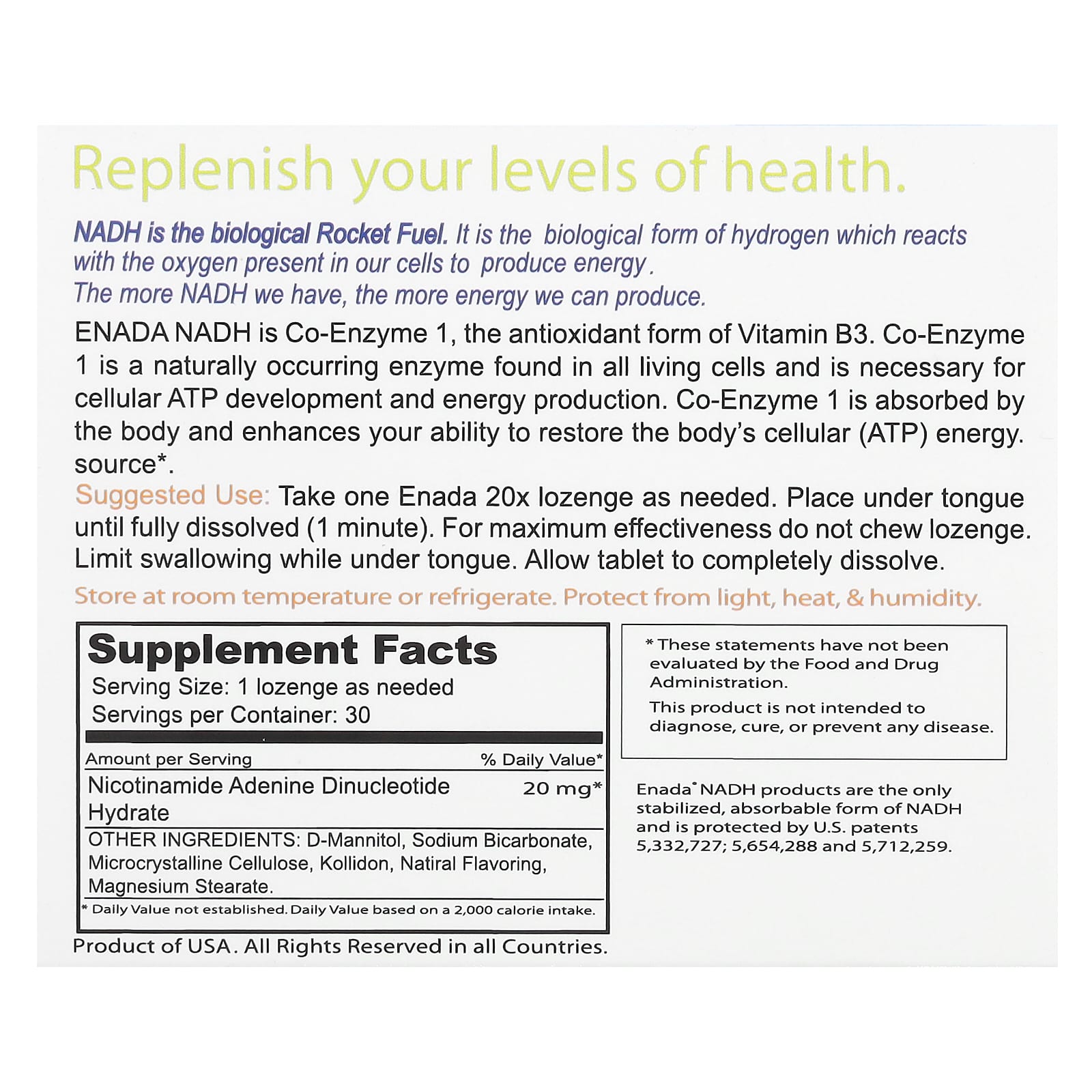 Dietary SupplementReturn to HealthEnergyStaminaFocusAlertness NADH Body Technology Be Greater Guaranteed for Purity, Freshness and Potency Replenish your levels of health.NADH is the biological rocket fuel. It is the biological form of hydrogen which reacts with the oxygen present in our cells to produce energy. The more NADH we have, the more energy we can produce. ENADA NADH is Co-Enzyme1, the antioxidant form of Vitamin B3. Co-Enzyme 1 is a naturally occurring enzyme found in all living cells and is necessary for cellular ATP development and energy production. Co-Enzyme 1 is absorbed by the body and enhances your ability to restore the body’s cellular (ATP) energy source.