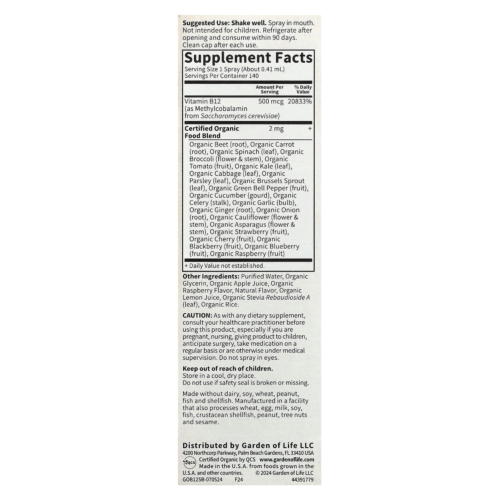 Garden of Life, Organics, B-12 Organic Spray, Raspberry, 2 fl oz (58 ml)