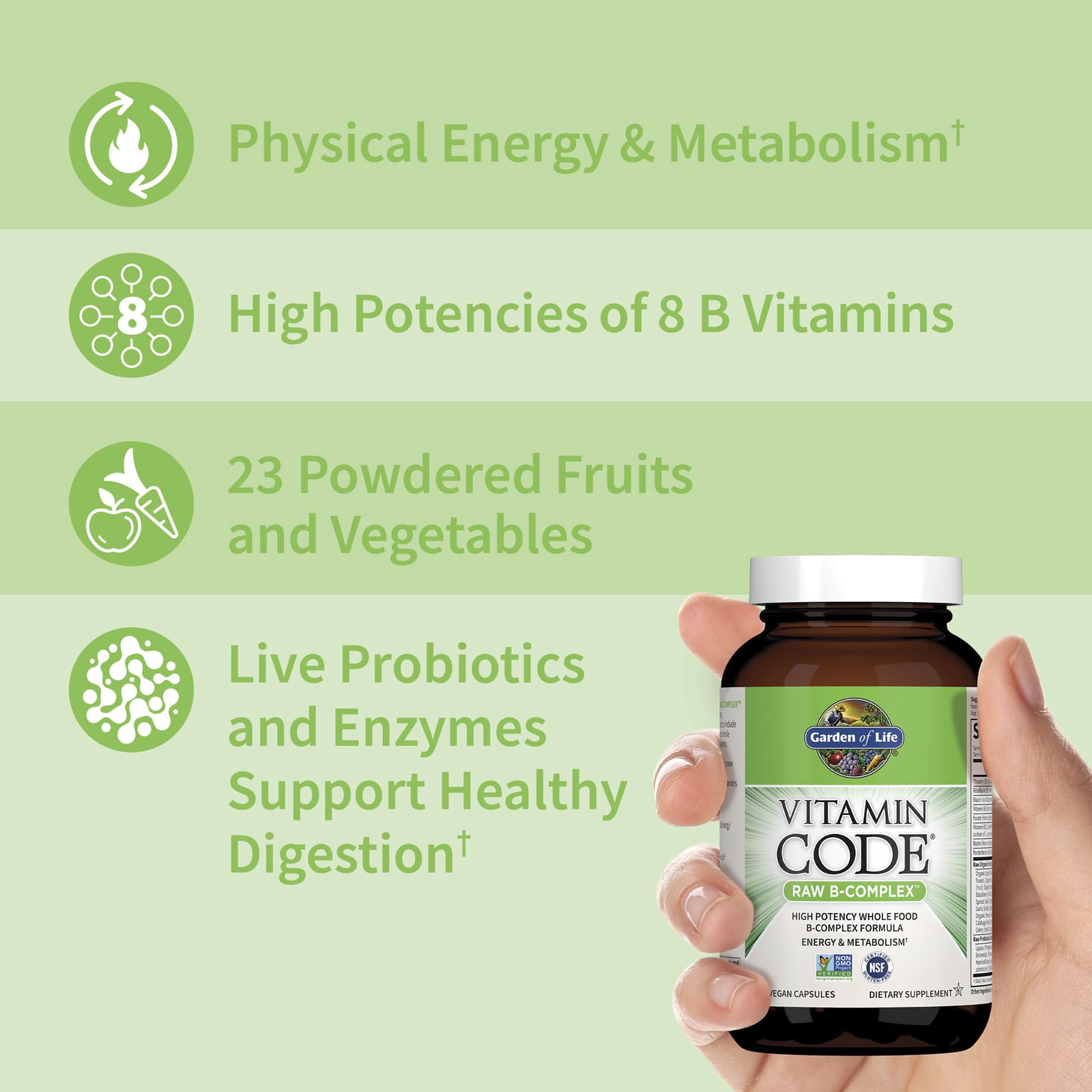 High Potency Whole Good B-Complex FormulaEnergy & MetabolismKosherCertified Gluten Free by NSFDietary SupplementVegan Certified Certified B CorporationWhat Raw MeansNo high heat, synthetic binders, fillers, artificial flavors, sweeteners, colors or additives commonly used in tablets.Non-GMO Project VerifiedIndependent, third party verification.B-CorpCertified by the nonprofit B Lab to meet rigorous standards of social and environmental performance, accountability and transparency.Vitamin Code® Raw B-Complex™ is whole food nutrition, specifically formulated to include high potencies of eight whole food complexed B Vitamins.23 powdered organically grown fruits and vegetables add supporting antioxidants, vitamins and nutrient cofactors.Mental and Physical EnergyHeart and Blood HealthHealthy Response to StressLive Probiotics and Enzymes Support Healthy Digestion