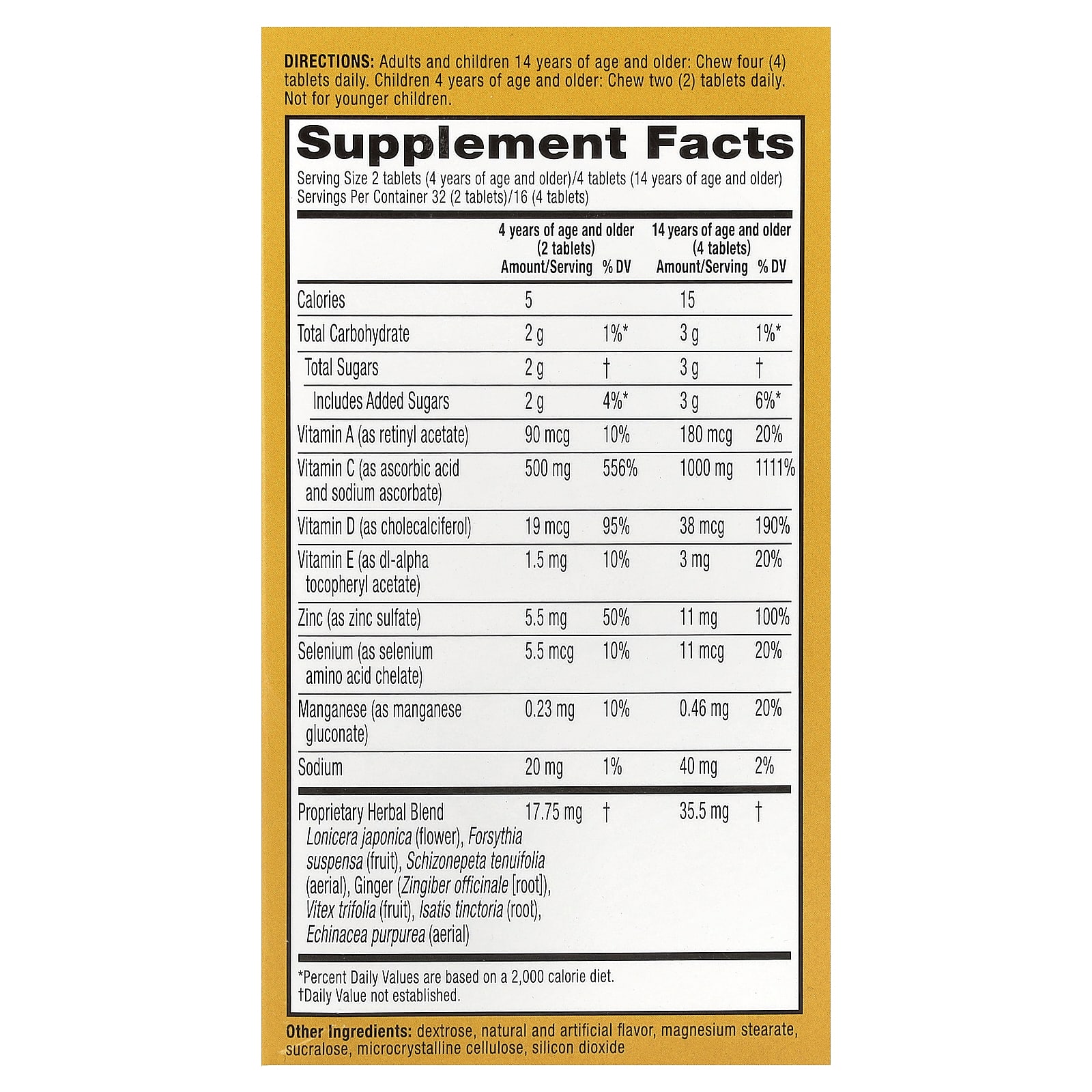 Natural & Artificial FlavorMore Immune Support Ingredients‡7 Key Nutrients for Immune SupportVitamin C + Vitamin D + Zinc + Vitamin A + E + Selenium + ManganeseDietary SupplementNo Water NeededGluten Free4 Chewable Tablets = 7 Immune Supporting Ingredients1,000 mg of Vitamin CWith 38 mcg (1,500 IU) of Vitamin DWith 100% Daily Value of ZincExcellent Source of Vitamin A, Vitamin E, Selenium & ManganeseOriginal Herbal Blend Including Echinacea & GingerOur Story Developed by a former school teacher, Airborne® products are a specially crafted blend of vitamins, minerals, & herbs designed to support your immune system.‡Now includes Vitamin D and more Zinc than our Original formula.