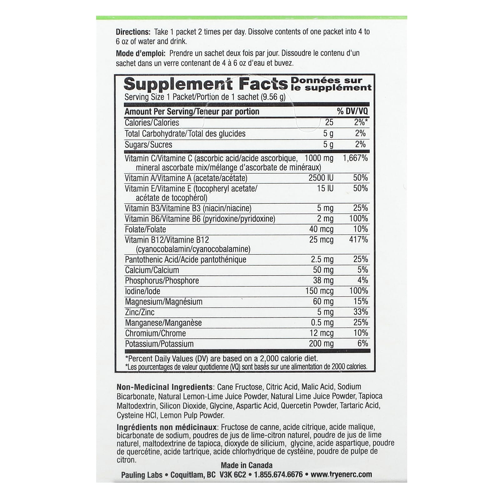 Non-Medicinal Ingredients: Cane fructose, citric acid, malic acid, sodium bicarbonate, natural lemon-lime juice powder, natural lime juice powder, tapioca maltodextrin, silicon dioxide, glycine, aspartic acid, quercetin powder, tartaric acid, cysteine HCl, lemon pulp water.