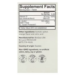 Protectis® TabsGut & Immune HealthClinically Proven800 IU Vitamin D3Probiotic SupplementMilk FreeLactose FreeGluten FreeGroundbreaking Probiotics Driven by ScienceCountry of Origin: Sweden Probiotic chewable tablets with vitamin D3 BioGaia® Protectis® KIDS tabs Immune Active is a dietary supplement containing the patented lactic acid bacterium Limosilactobacillus reuteri Protectis ® (L. reuteri DSM 17938) and vitamin D3 that contributes to the normal function of the immune system. L. reuteri Protectis helps the good microorganisms keep a natural balance in the gut and has been tested in more than 150 clinical trials and proven safe & effective for children.