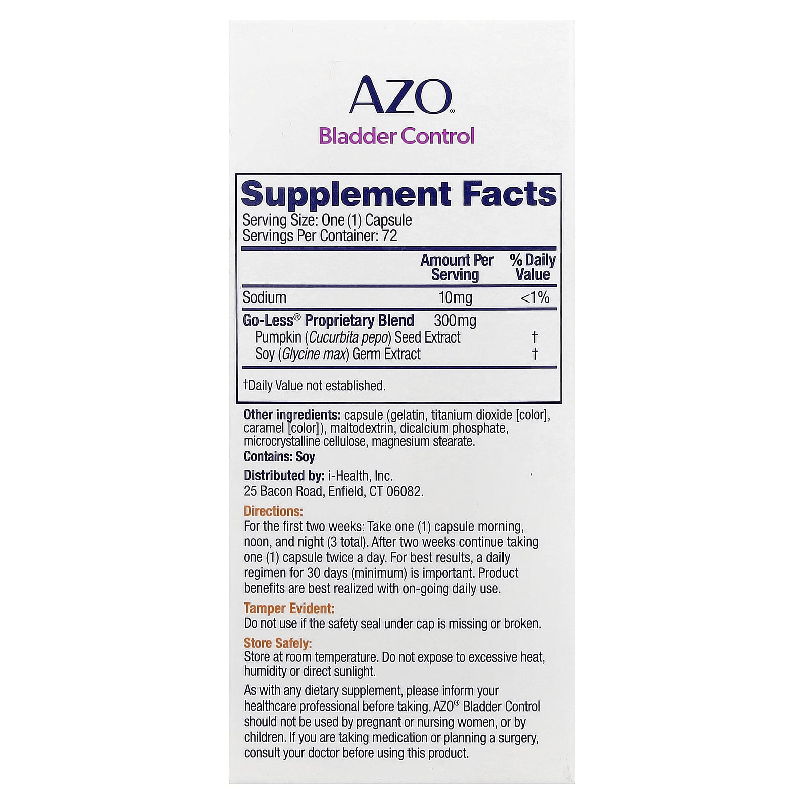 Tamper Evident: Do not use if the safety seal under cap is missing or broken. Store Safely: Store at room temperature. Do not expose to excessive heat, humidity or direct sunlight. As with any dietary supplement, please inform your healthcare professional before taking. AZO® Bladder Control should not be used by pregnant or nursing women, or by children. If you are taking medication or planning a surgery, consult your doctor before using this product.