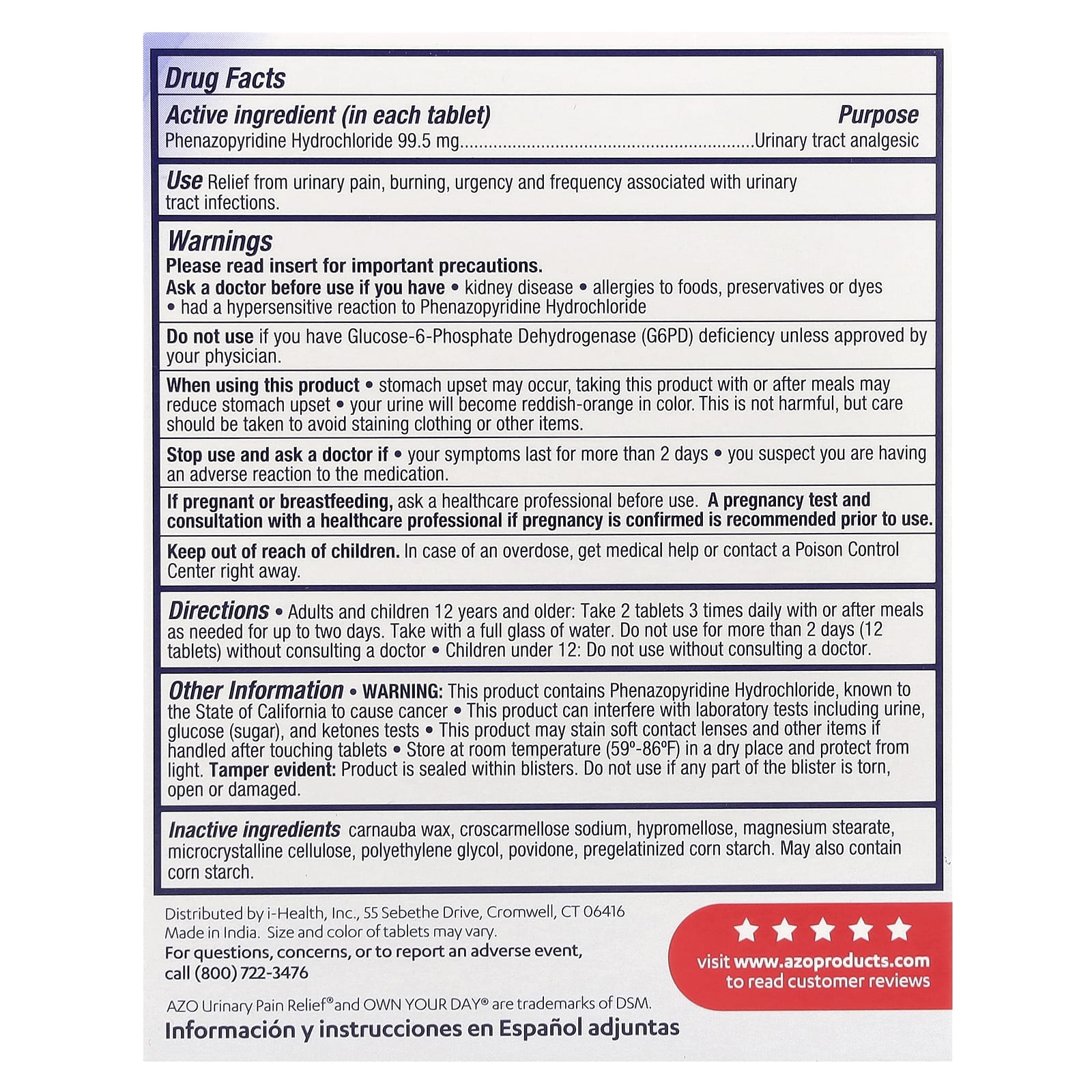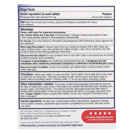 Please read insert for important precautions.Ask a doctor before use if you haveKidney diseaseAllergies to foods, preservatives or dyesHad a hypersensitive reaction to Phenazopyridine HydrochlorideDo not use if you have Glucose-6-Phosphate Dehydrogenase (G6PD) deficiency unless approved by your physician.When using this productStomach upset may occur, taking this product with or after meals may reduce stomach upset.Your urine will become reddish-orange in color. This is not harmful, but care should be taken to avoid staining clothing or other items.Stop use and ask a doctor ifYour symptoms last for more than 2 daysYou suspect you are having an adverse reaction to the medication.If pregnant or breastfeeding, ask a health professional before use. A pregnancy test and consultation with a health professional if pregnancy is confirmed is recommended prior to use.Keep out of reach of children. In case of an overdose, get medical help or contact a Poison Control Center right away.Other InformationThis product contains Phenazopyridine Hydrochloride, known to the State of California to cause cancerThis product can interfere with laboratory tests including urine, glucose (sugar), and ketones testsThis product may stain soft contact lenses and other items if handled after touching tabletsStore at room temperature (59º-86ºF) in a dry place and protect from lightTamper evident: Product is sealed within blisters. Do not use if any part of the blister is torn, open or damaged.