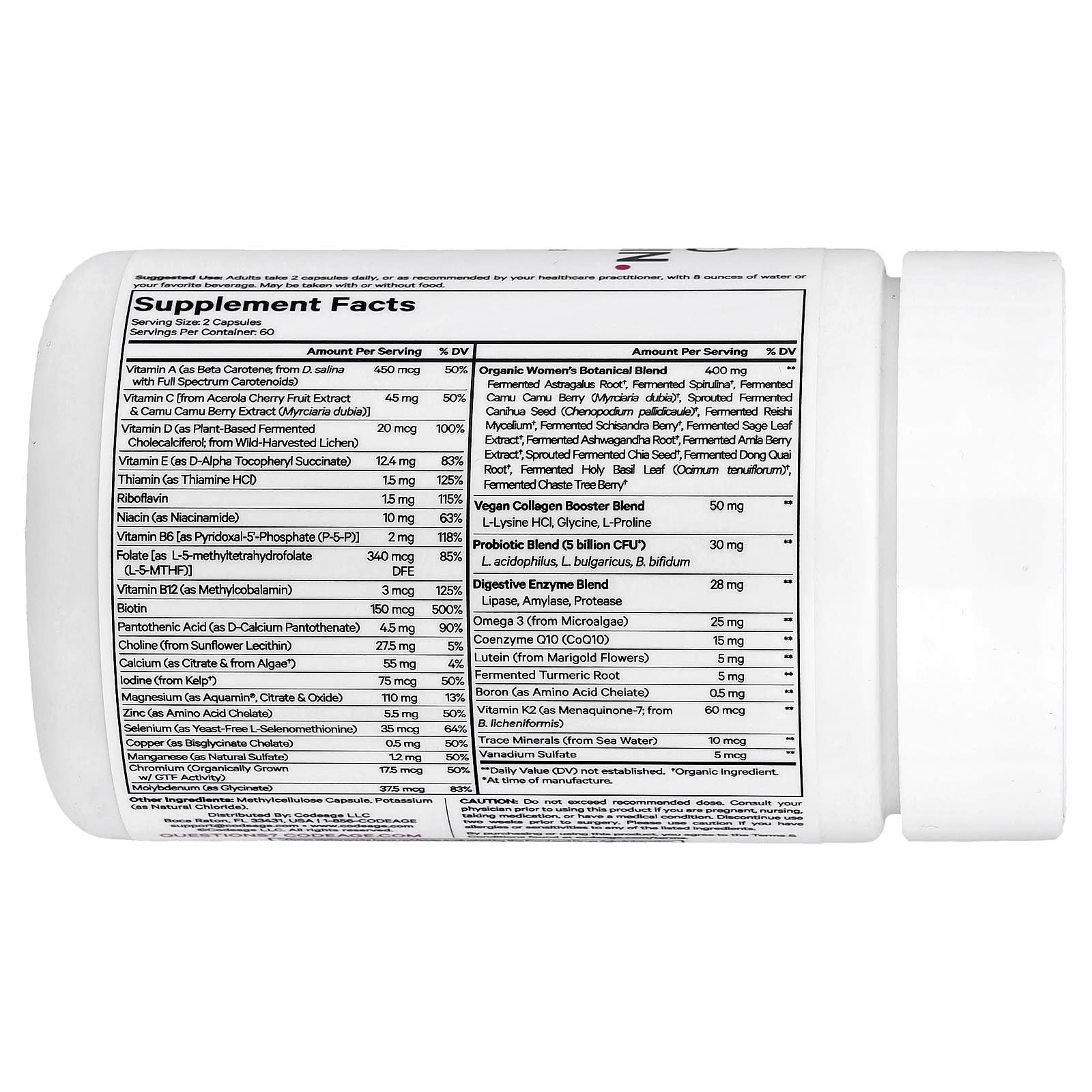 25+ Vitamins & MineralsCoQ10ProbioticsOmega-3Immune Health SupportDietary SupplementDigestive EnzymesEssential VitaminsWhole FoodsAmino AcidsVeganNon-GMOSoy-FreeDairy-FreeGluten-FreecGMP Certified ManufacturingFeel DifferentCodeage Women’s Daily Multivitamin is a comprehensive all-in-one capsule formula that offers 25+ daily vitamins and minerals for women of all ages. It contains a blend of real whole foods vitamins, probiotics, enzymes, organic veggies, fruits, and herbs.