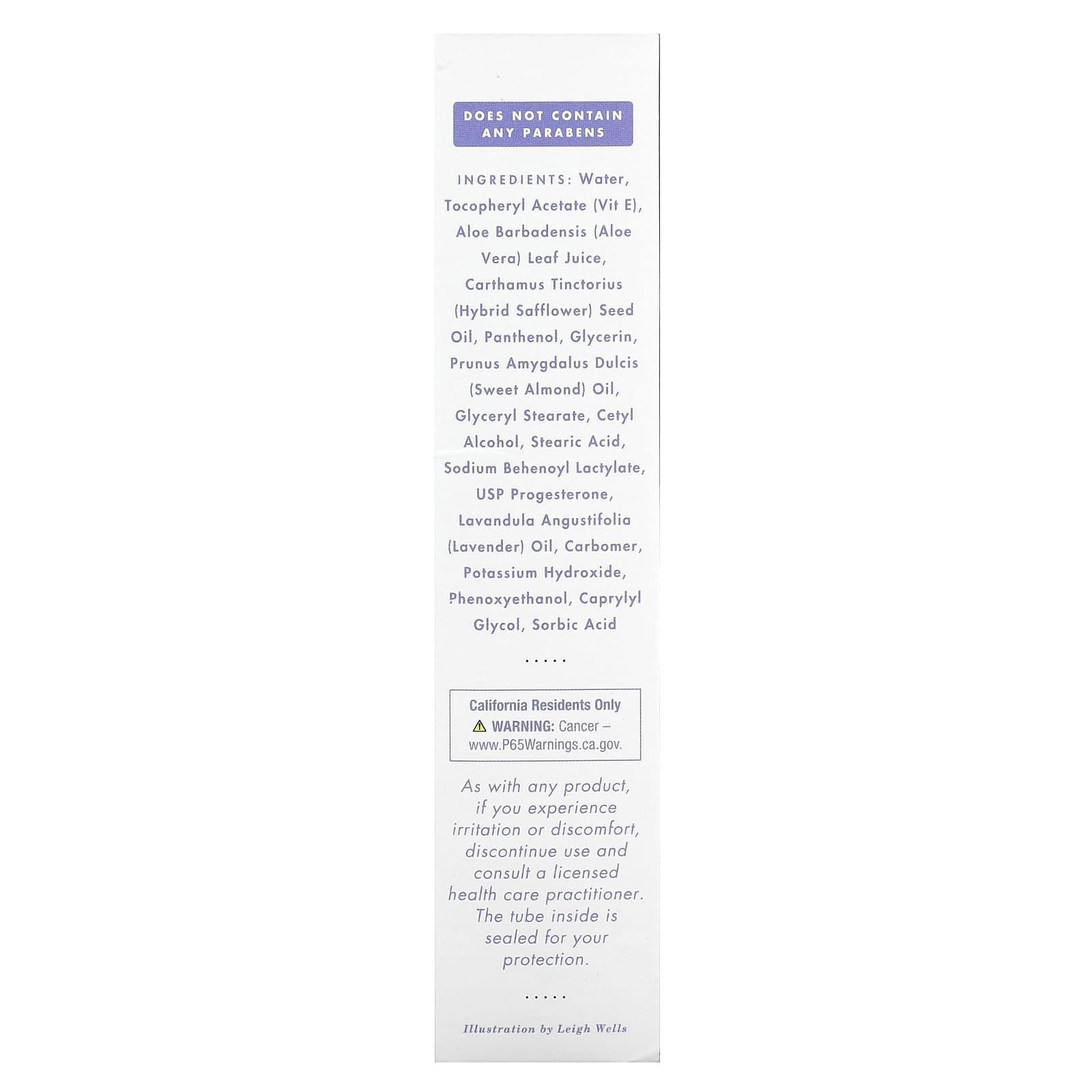 Water, tocopheryl acetate (vit E), aloe barbadensis (aloe vera) leaf juice, carthamus tinctorius (hybrid safflower) seed oil, panthenol, glycerin, prunus, amygdalus dulcis (sweet almond) oil glyceryl stearate, cetyl alcohol, stearic acid, sodium behenoyl lactylate, usp progesterone, lavandula angustifolia (lavender) oil, carbomer, potassium hydroxide, phenoxyethanol, caprylyl glycol, sorbic acid.Does not contain any parabensWhat’s in it: Contains 450 mg of USP Progesterone per ounce (20 mg per ¼ teaspoon), plus the calming scent of lavender oil. Check the side of the box for a complete list of ingredients.What’s not in it: No parabens, mineral oil, petroleum or animal anything. And our products are never tested on animals.