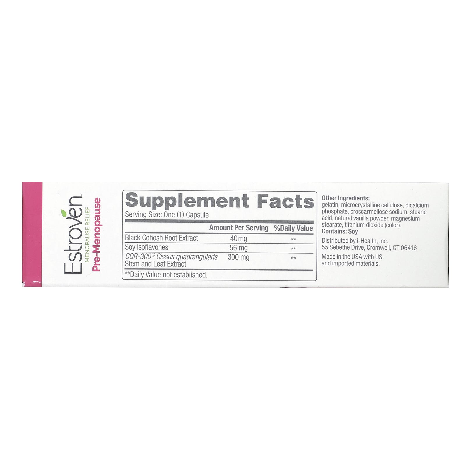 #1 Brand of Choice Among Women‡Supports a Healthy MetabolismDietary SupplementIncludes Naturally Sourced IngredientsOnly 1 Capsule Per DayFrom the #1 Pharmacist Recommended Brand†Black CohoshSoyCQR-300®Drug FreeEstrogen Free††Hormone Free††Relief for:Hot FlashesNight SweatsWeight ManagementYour body’s going through changes. Night sweats … irregular periods … weight changes … You might be going through peri-menopause. Did you know symptoms can start at 35? Estroven® Pre-Menopause uses naturally sourced, clinically proven ingredients to get you feeling like yourself again. Black Cohosh and Soy Isoflavones reduce hot flashes and night sweats. The botanical extract COR-300® helps balance falling serotonin levels, supporting healthy weight management.‡Based on custom Nielsen US xAOC 52 W/E 11/30/24.†Based on Pharmacy Times Survey, 2024 (Women’s Health/Menopause Supplement Category.††Estroven® Pre-Menopause does not contain synthetic, animal, or human derived hormones.