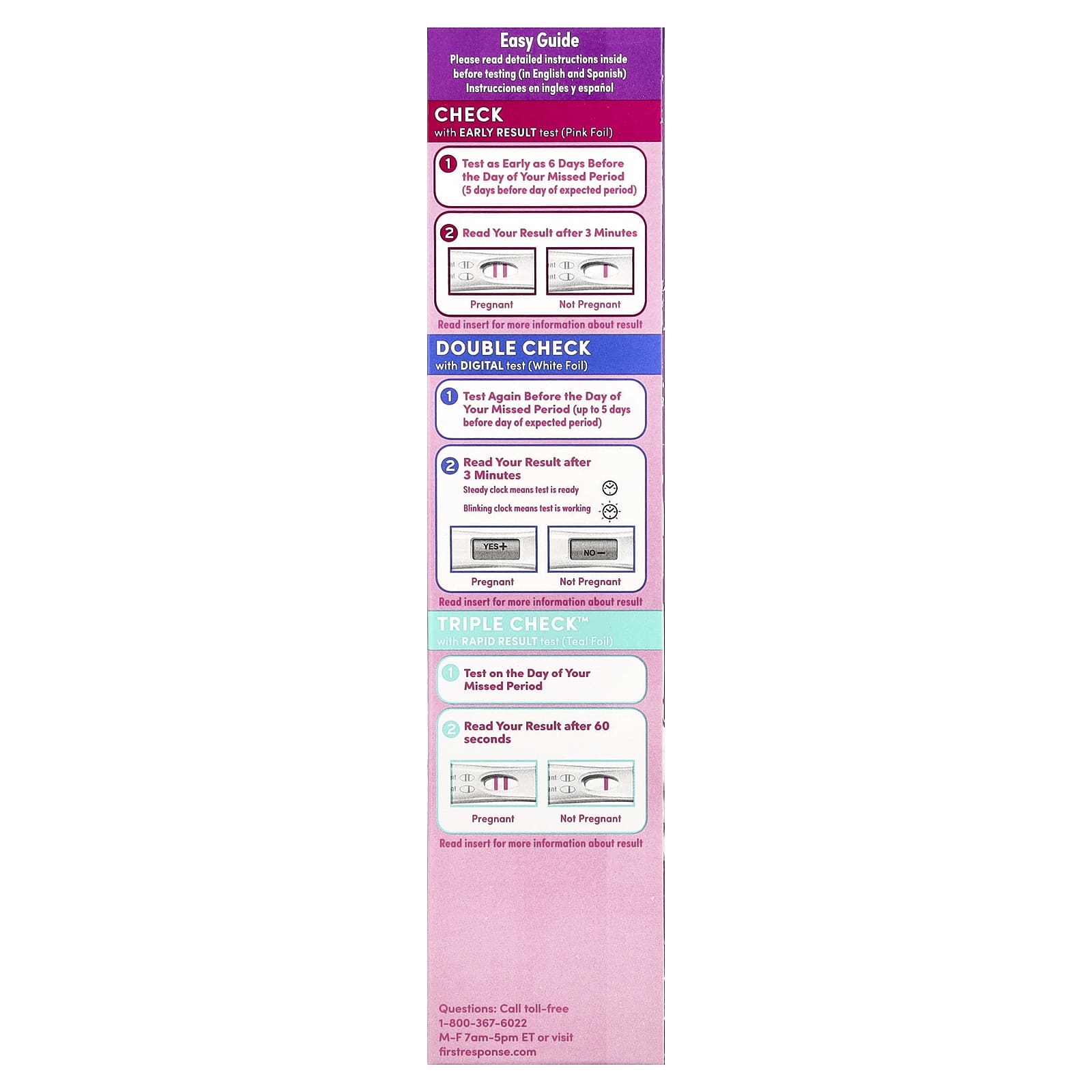 Easy Guide – Please read detailed instructions inside before testing.Check with Early Result Test (Pink Foil)Test as early as 6 days before the day of your missed period (5 days before day of expected period)Read your result after 3 minutes Read insert for more information about result.Double Check with Digital Test (white foil)Test again before the day of your missed period (up to 5 days before day of expected period)Read your result after 3 minutes. Steady clock means test is ready.Blinking clock means test is working.Read insert for more information about result.Triple Check™ with Rapid Result Test (Teal foil)Test on the day of your missed periodRead your result after 60 seconds Read insert for more information about result.
