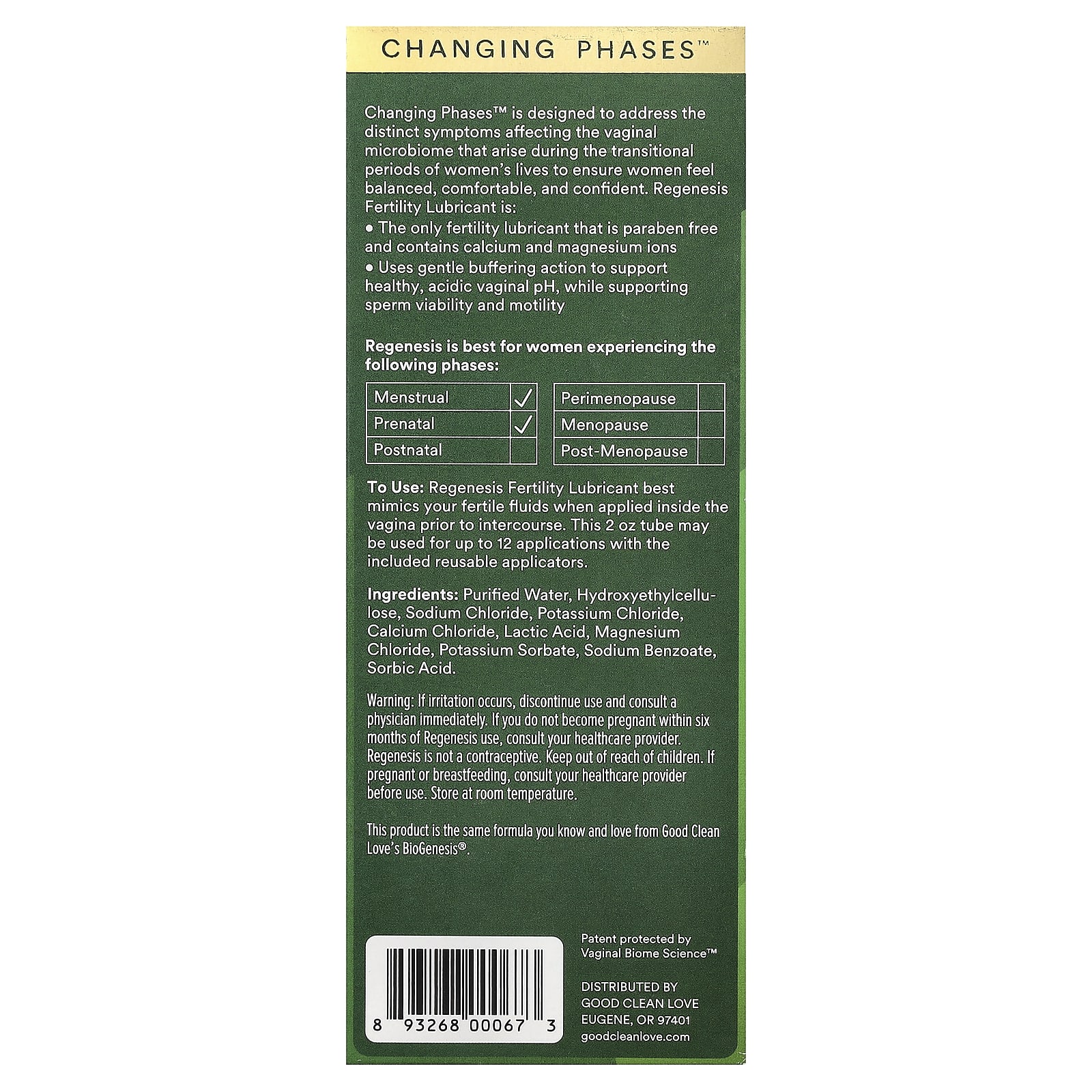 Changing Phases™BioMatch® TechnologyCertified B CorporationWorks the Way You Do®Supports sperm viability and healthy vaginal flora to aid conception. Good Clean Love makes vaginal wellness products that support a healthy vaginal microbiome. Regenesis Fertility Lubricant is: The only fertility lubricant that is paraben free and contains calcium & magnesium ionsSupporting sperm viability and motilityClinically provenGynecologist- recommended*Paraben freeFDA-cleared, patent pending formulaGood Clean Love is a certified B-corp using recyclable bio-plastic sugar cane tubes as part of its commitment to sustainability.Changing Phases™ is designed to address the distinct symptoms affecting the vaginal microbiome that arise during the transitional periods of women’s lives to ensure women feel balanced, comfortable, and confident. Regenesis Fertility Lubricant is:The only fertility lubricant that is paraben free and contains calcium and magnesium ions.Uses gentle buffering action to support healthy, acidic vaginal pH, while supporting sperm viability and motility.Regenesis is best for women experiencing the following phases:MenstrualPrenatalWhat is Bio-Match®? A 3-layer stacked patented technology supporting optimal vaginal microbiome health.Iso-osmotic protects and stabilizes vaginal moisturepH-balances lowers pH to optimal range for healthy bacteria to thriveProprietary lactic acid blend nourishes a diverse range of healthy lactobacilli*Among gynecologists aware of the brand in a national survey.