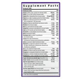 Ferment media (organic soy flour, organic saccharomyces cerevisiae, organic orange peel powder, organic carrot powder, organic alfalfa powder, lactic acid bacteria [lactobacillus acidophilus, bifidobacterium bifidum and lactobacillus rhamnosus], papain [deactivated], bromelain [deactivated]), organic gum acacia; less than 2% of: silica, lac resin and carnauba wax.Contains: Fermented soy.