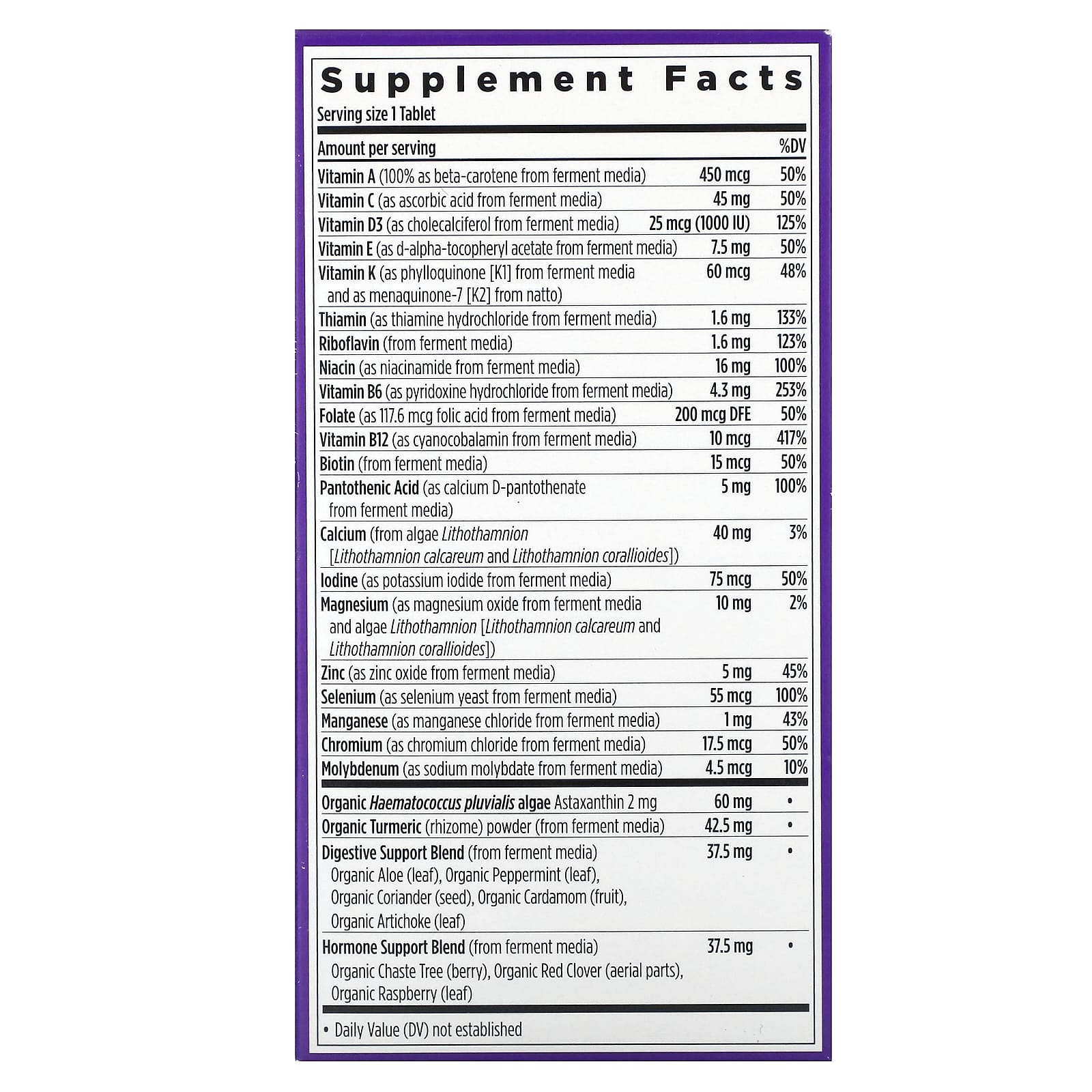 Est. 1982Formulated for AbsorptionMade with Organic Vegetables & HerbsCertified Organic by Where Food Comes From OrganicNSF Certified Gluten-FreeNon-GMO Project VerifiedKosherDietary Supplement100% VegetarianNo Artificial Flavors or ColorsCertified B CorporationWith Gratitude from VermontNutrition Crafted For: Immune, Heart, Bone & Cellular Energy Support*The Magic Inside: Essential nutrients your body can recognize, fermented & blended with superfood herbs and Astaxanthin*Complete MultivitaminFor the Needs of Women 55+Expertly formulated to support the holistic health needs of women 55+, with nutrients for brain, eye, bone & breast health support, stress, mood, vision & digestive support, and healthy hair, skin & nails.* Iron-Free.Immune & Energy BoostingSupports immune health with Vitamins C & E,† plus Astaxanthin–a rare plant-nutrient from organic algae.* 8 fermented B Vitamins promote cellular energy metabolism.*Heart Healthy Vitamin D3 supports cardiovascular health, including healthy blood pressure support.Holistic HerbsInspired by tradition and grounded in science, advanced organic botanicals include Turmeric, Red Clover and Raspberry leaf.Absorb the Good StuffWe fine-tune the levels of each high-quality vitamin & mineral, choose types that work best with the body, and ferment key nutrients with probiotics and whole foods. †Not a sole source of this nutrient; a healthy diet is also important.