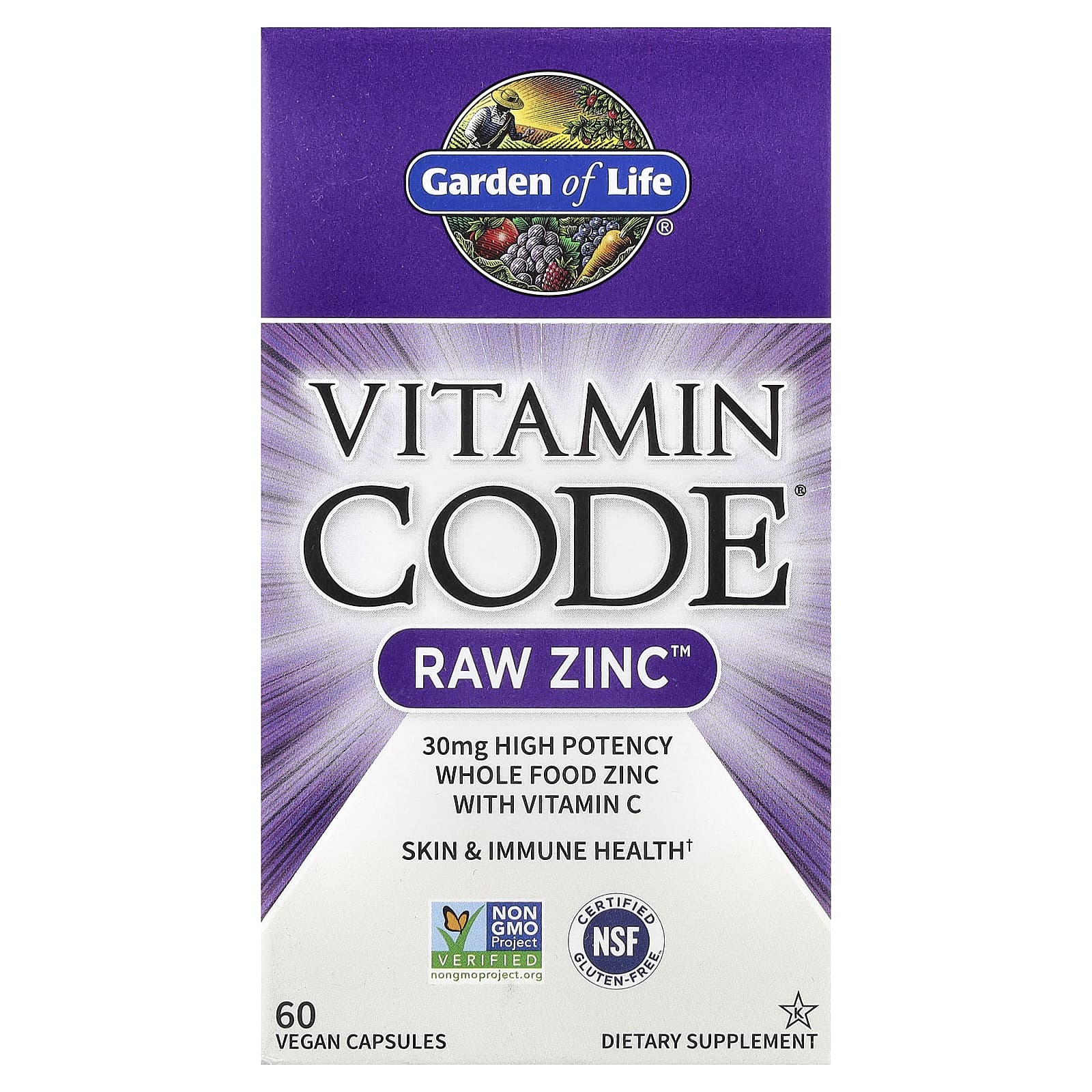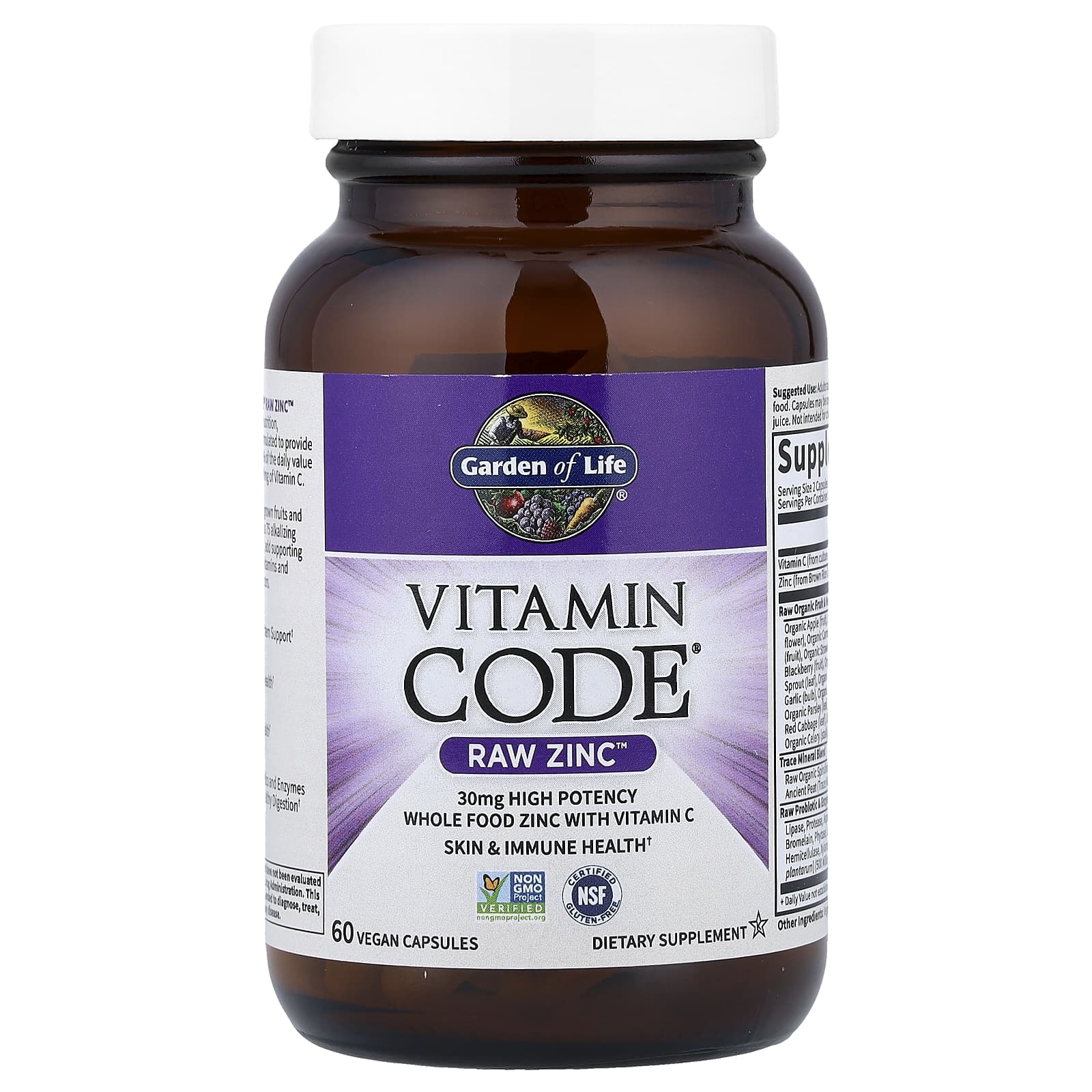 30 mg High Potency Whole Food Zinc with Vitamin C Skin & Immune Health Non GMO Project VerifiedNSF Certified Gluten-FreeKosherDietary SupplementWhat Raw MeansNo high heat, synthetic binders, fillers, artificial flavors, sweeteners, colors or additives commonly used in tablets.Non GMO VerifiedIndependent, third party verification.Vegan CertifiedThird Party certifiedCertified B CorporationCertified by the nonprofit B Lab to meet rigorous standards of social and environmental performance, accountability and transparency.Vitamin Code® Raw Zinc™ is whole food nutrition, specifically formulated to provide 30 mg and 273% of the Daily Value for Zinc, plus 60 mg of Vitamin C.23 powdered organically grown fruits and vegetables, plus 75 alkalizing trace minerals, add supporting antioxidants, vitamins and nutrient cofactors.Immune system supportSkin & eye healthProstate healthLive probiotics and enzymes support healthy digetion